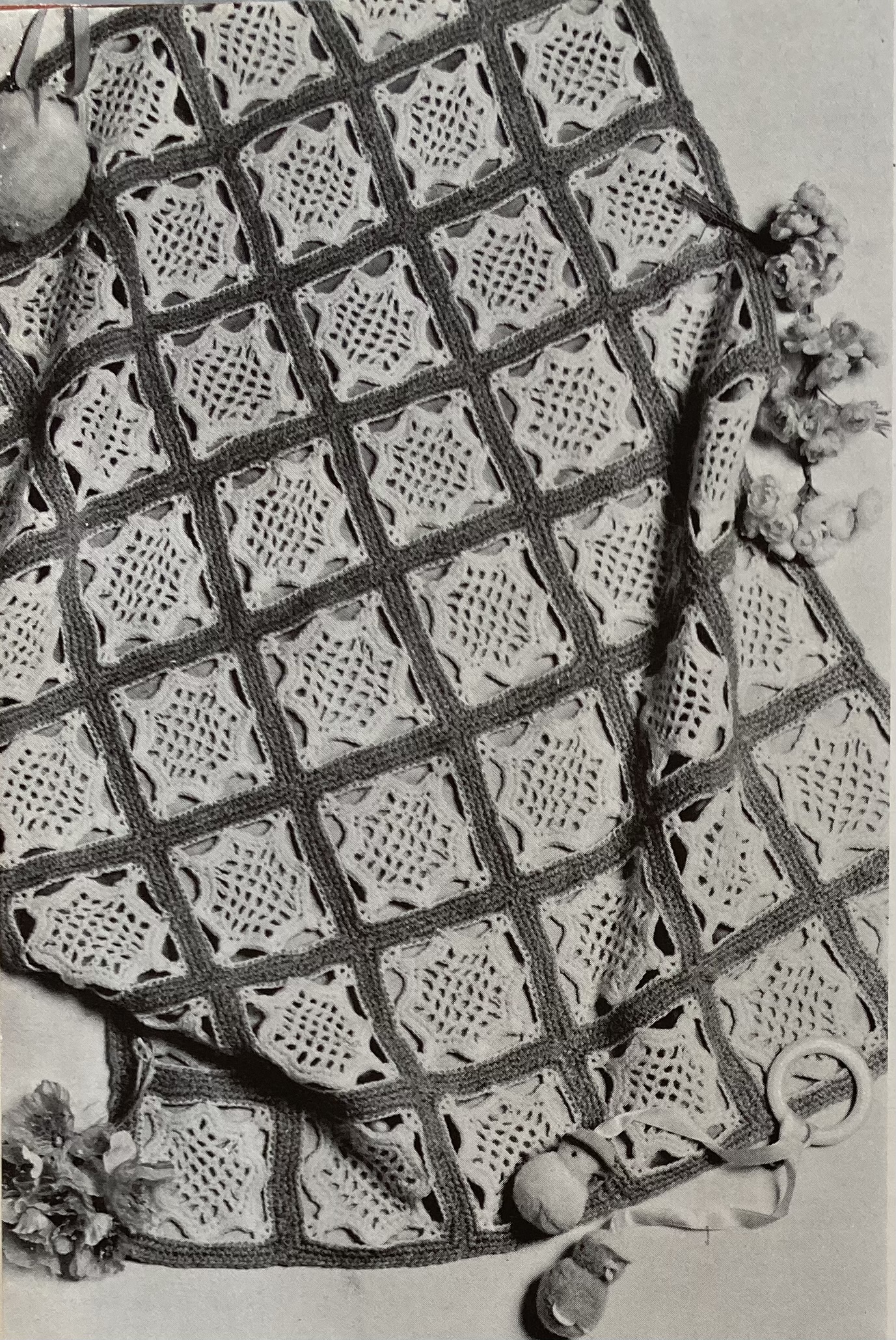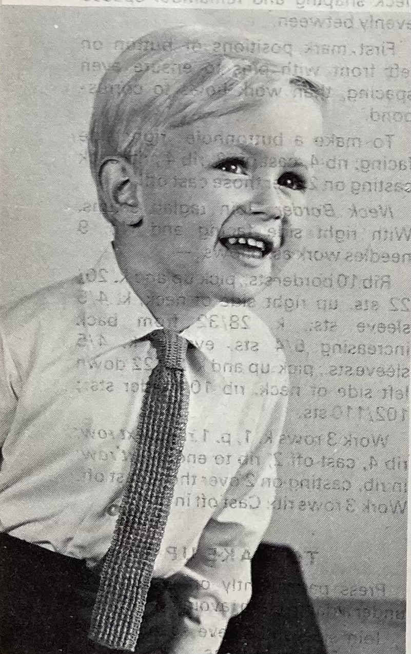Crochet fans can make something for baby, too: a soft and pretty blanket made of 48 lacy motif squares in Patons “Fiona”, bordered with plain dark bands and lined with blue fabric. You can make a lacy blouse for yourself in the usual Mercer-Crochet thread, and use the leftovers to make a tie for a little boy for Easter! Can’t tell if the kid is happy about having to wear a tie or not, or if someone is holding a candy bar just behind the camera.