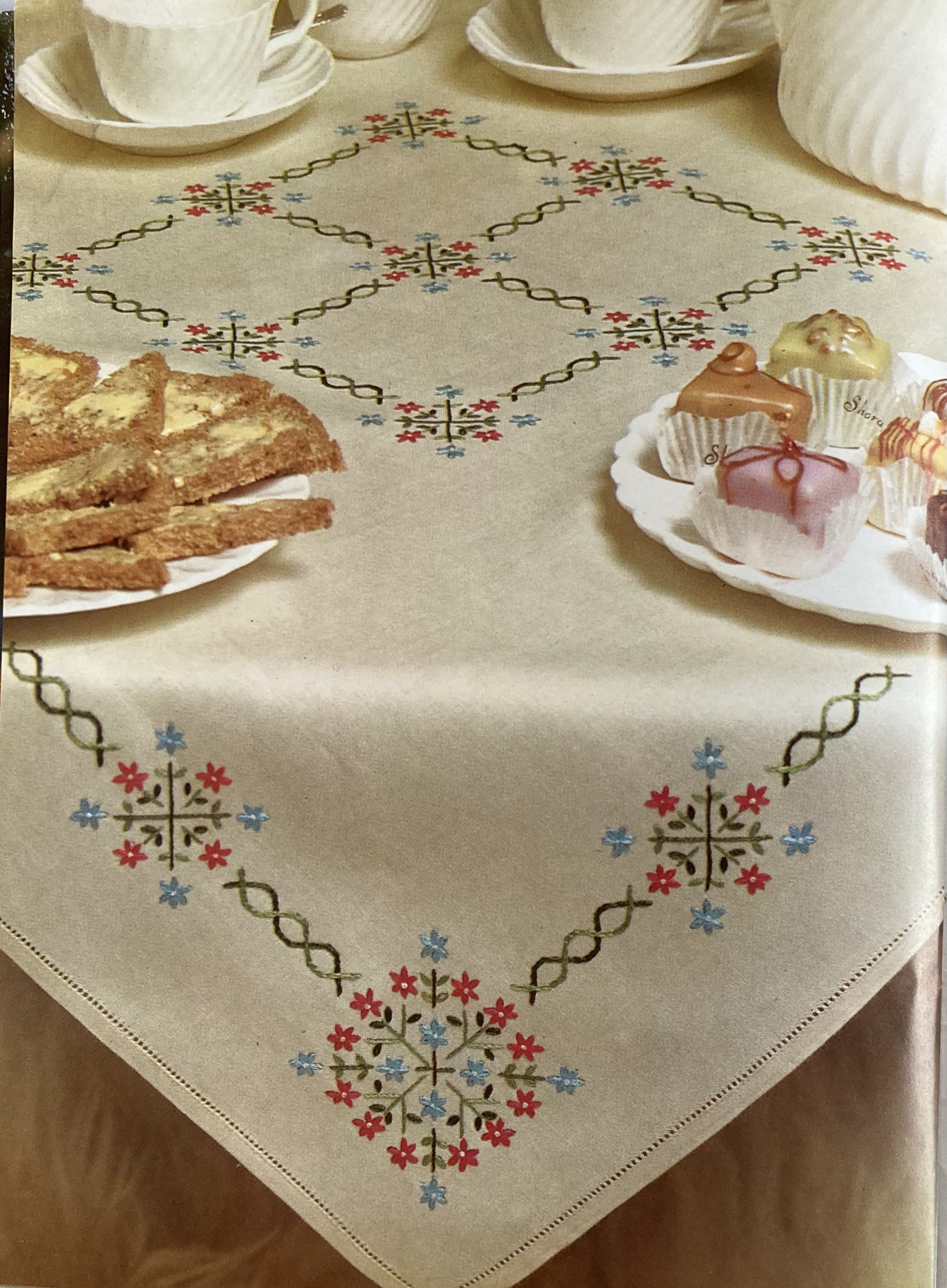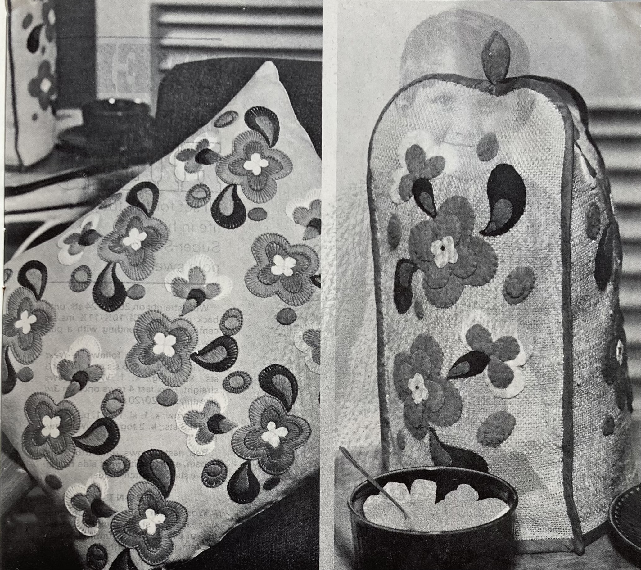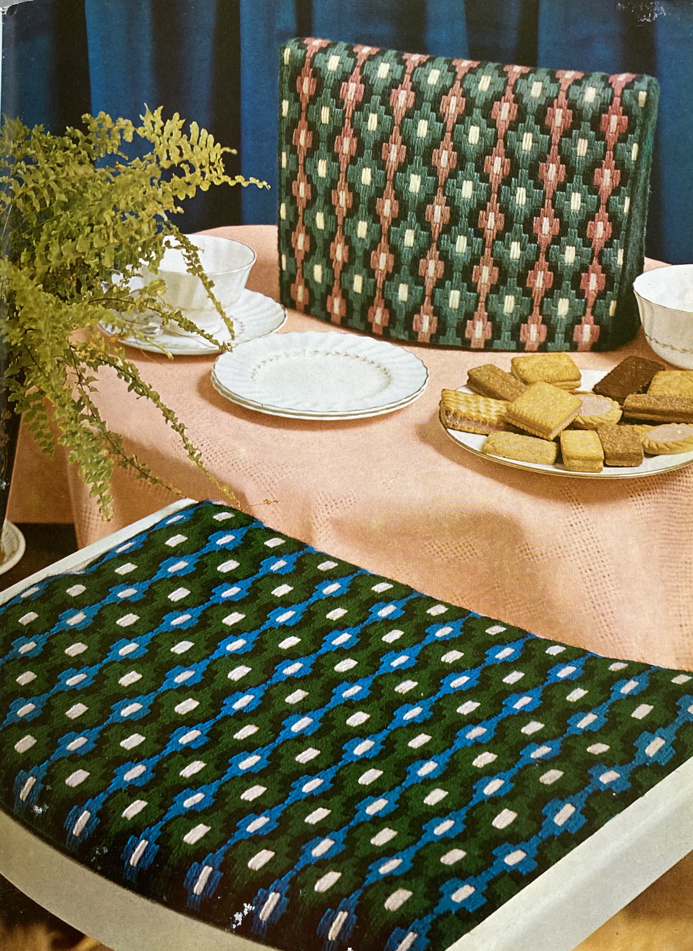 With all those great Spring fashions, it’s no wonder that the homewares are a little boring this time. There’s a little flower motif to embroider on an apron, or place mats, or a tablecloth, and a wonderful and very 60s floral design for a cushion in wool embroidery, or adapted to appliqué for a coffee cosy. Beginning embroideresses can practice stem stitch, loop stitch and chain stitch with lots of simple motifs on a tablecloth. There’s also an easy Florentine tapestry design for a large tea cosy or stool-top.
