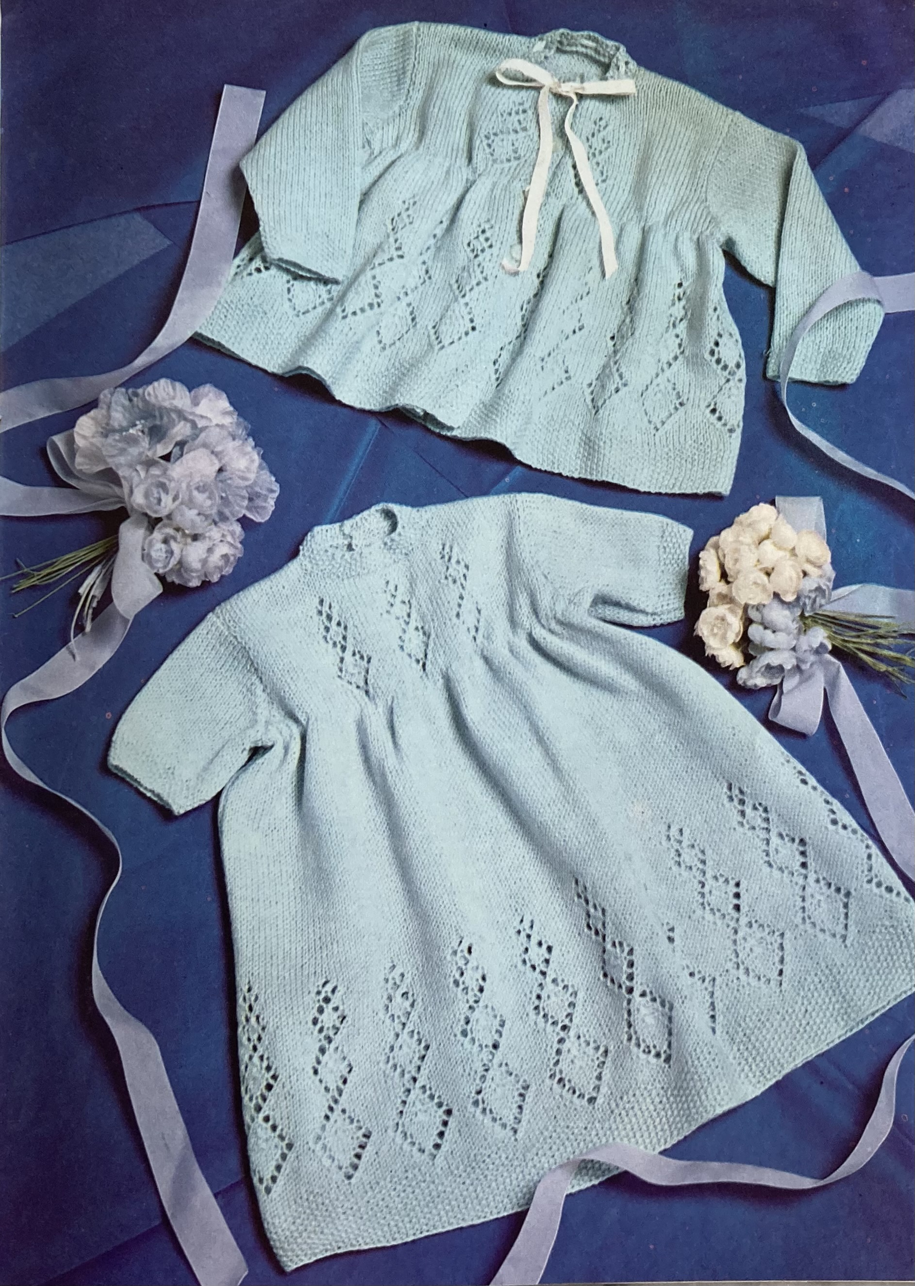 Men, boys and babies get their due as well. The men’s Aran-patterned cardigan in thick “Capstan” wool features the same model from the September 1967 issue, who looks like a friend of mine. The cardigan, available in four sizes from 39-40 to 45-46 inch chest, seems way too big for him, though. The photo of the boy’s “Super-Sonic” polo sweater has the same too-bulky, too big mismatch, though anything knit the “Super-Sonic” way (6 ! strands of DK wool held together on huge “Maxi Pin” needles to get 3 stitches to the inch) will look huge and bulky anyway. Babies, at least, still wear fine-knits, like the lacy set of dress and matinee coat for Spring.