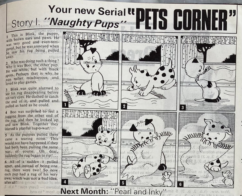 There’s a new serial comic, “Pets Corner”, whose first episode features puppie Blink and Boo, who do rascally puppy stuff and end up tearing a rug apart. But then they each have their own rug, so it’s all good.