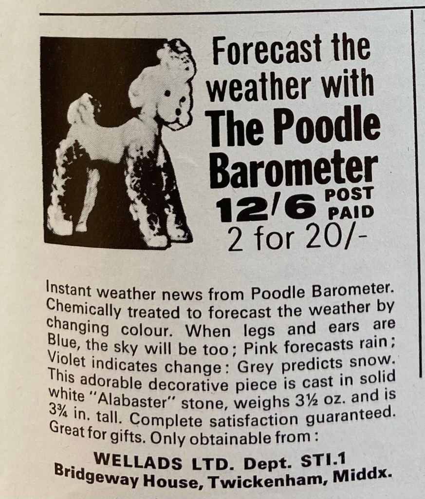 Yes, a poodle barometer. A decorative stone poodle that has been chemically treated with something that presumably responds to changes in humidity and/or temperature. Okay? I too have a vintage poodle, so I shouldn’t say anything. Mine is made of porcelain and doesn’t predict the weather, but does a great job guarding my grandmother’s 1950s Rosenthal coffee service.