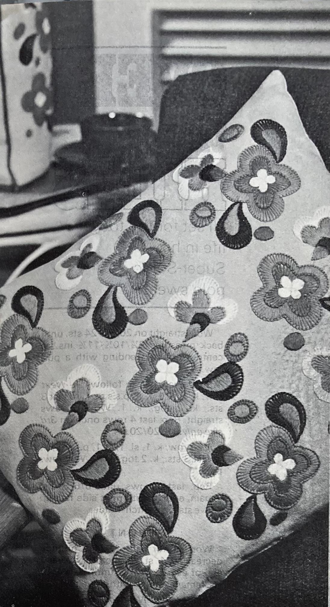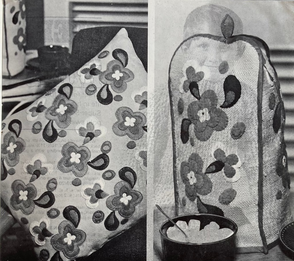 There were some nice knitting designs in the March 1968 issue of Stitchcraft as well as a very 1960s “bold and bright” embroidery/appliqué design. Captioned “The Modern Look for Embroidery”, it featured flower motifs in a sort of, I don’t know the word — cartoon style? The opposite of delicate and ornate. You could embroider them onto a cushion or appliqué them onto a coffee cosy. I have more cushions than sofas and do not need a coffee cosy, but a new laptop case would be useful and pretty.