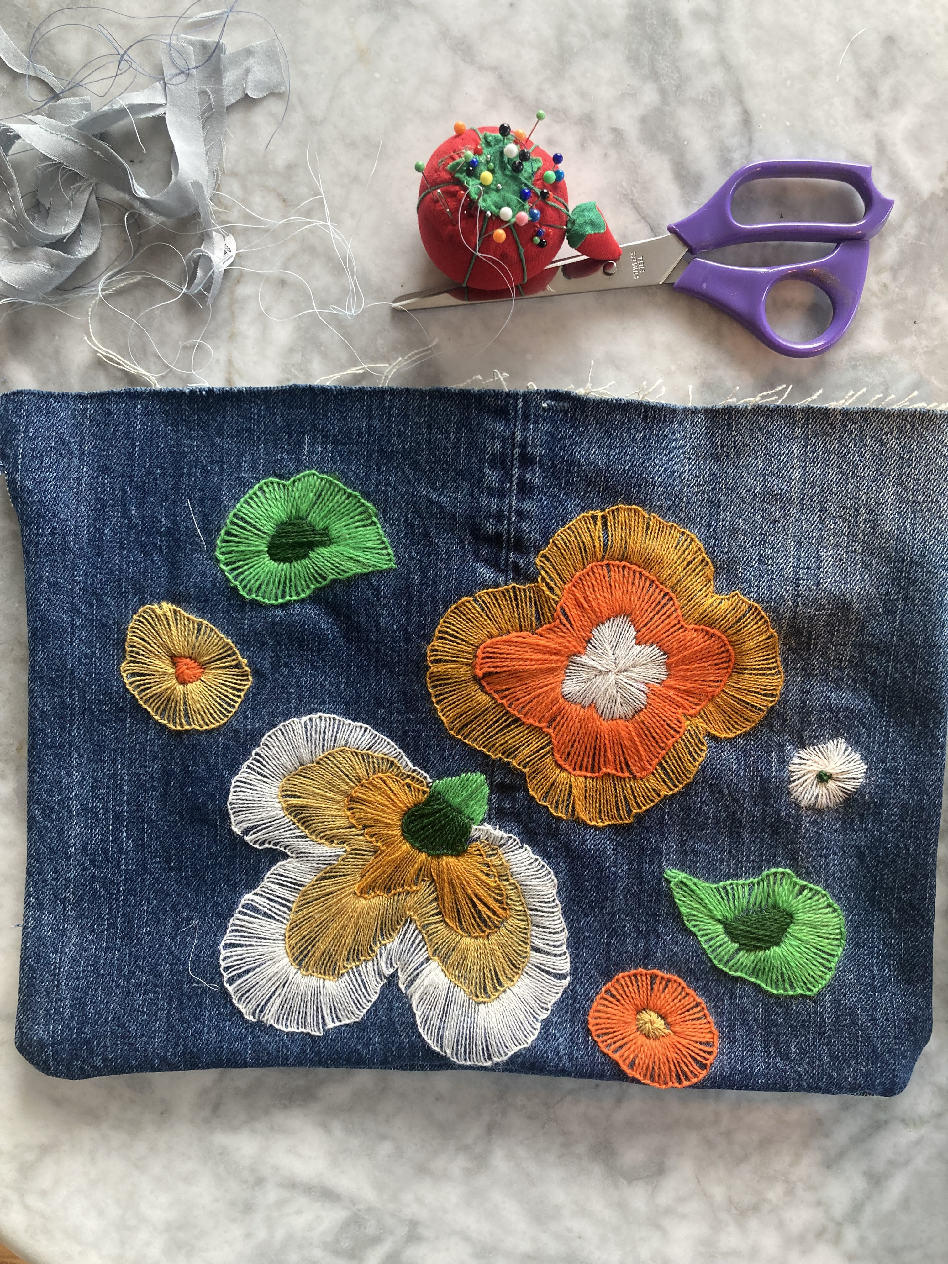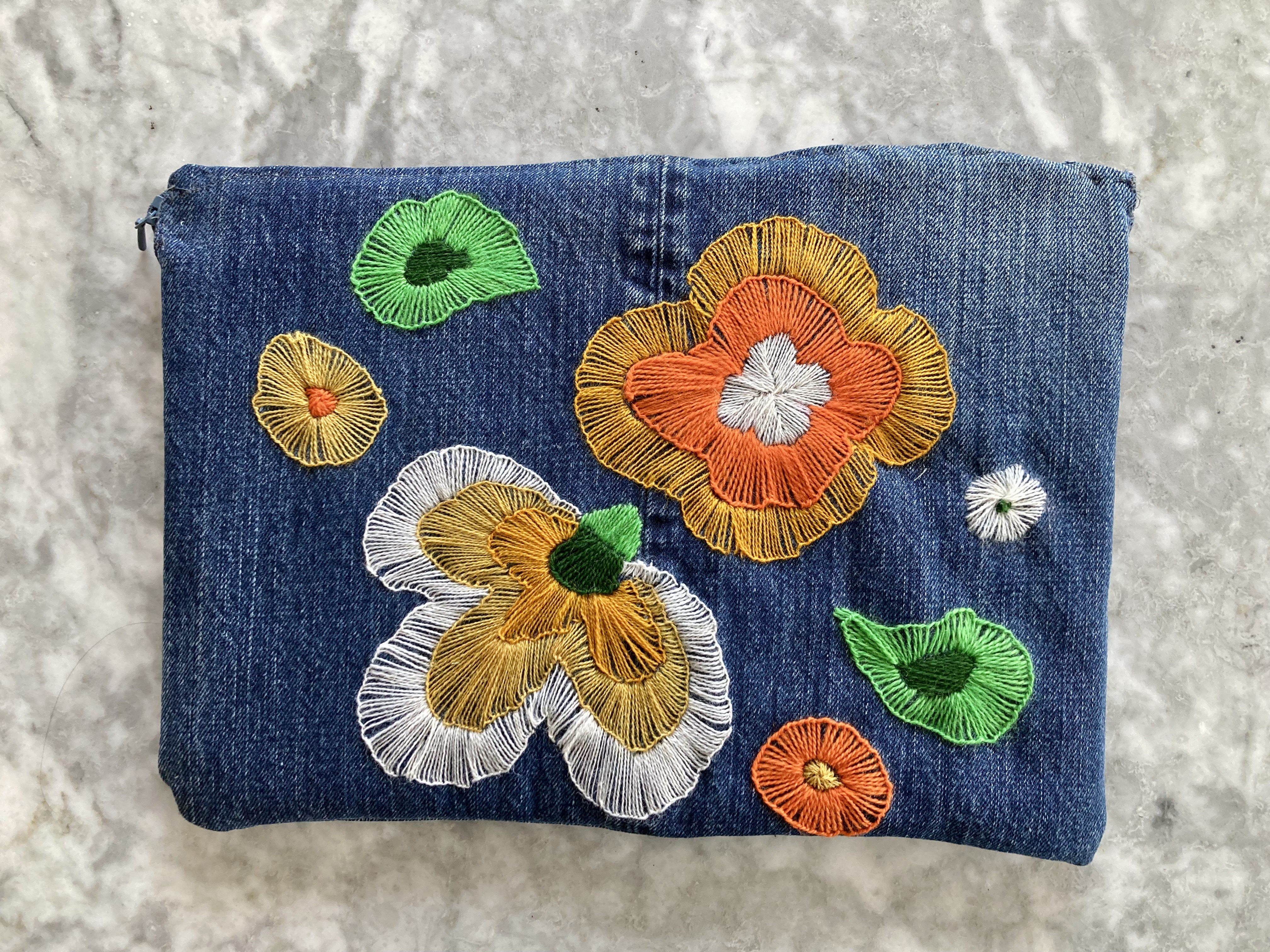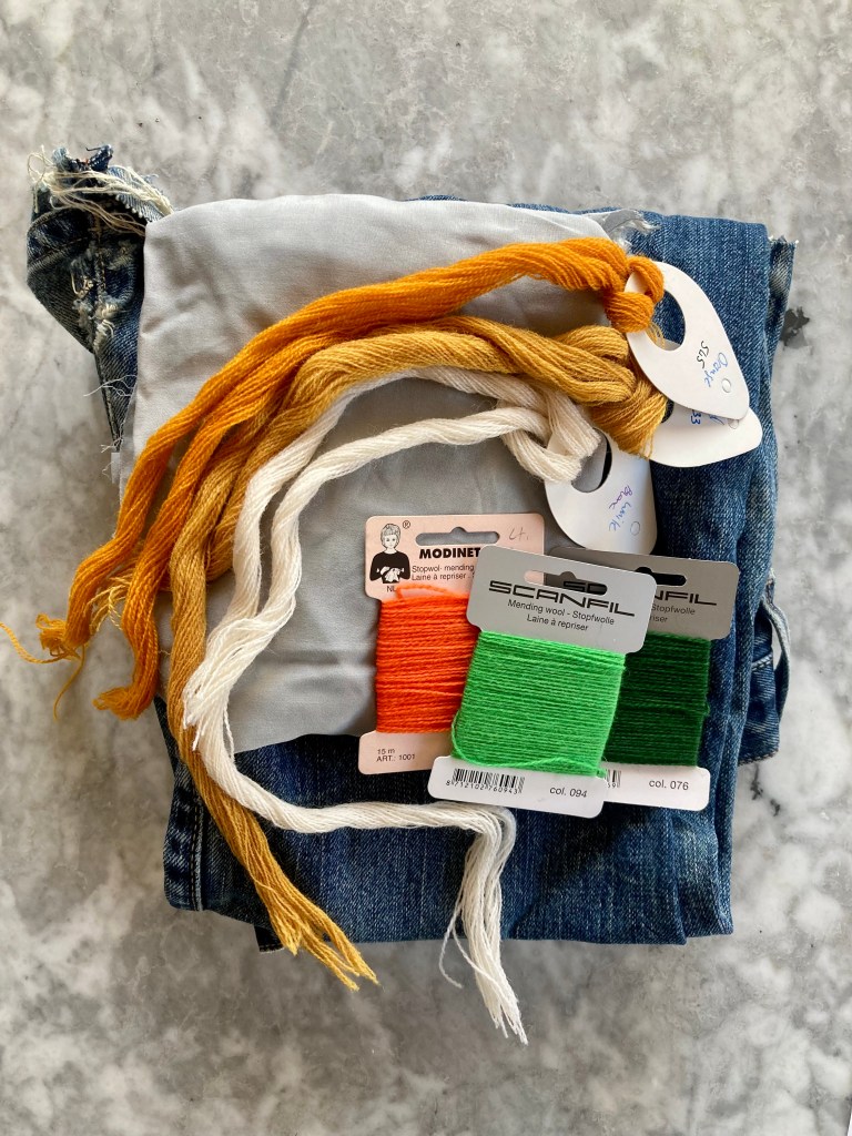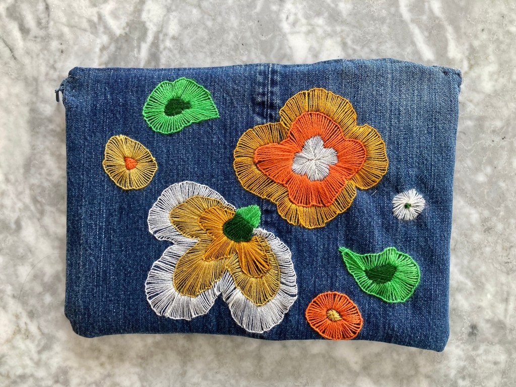 In keeping with the spirit of upcycling / using up scraps before buying new products, I decided to make the embroidered version, since I had some wool embroidery thread in the appropriate colours (gold, orange, white and two shades of green) left over from other projects. I had lots of appliqué felt too, but not the right colour scheme. Still had plenty of denim from an upcycled pair of jeans (original would have been yellow furnishing linen), lining fabric from the fabric drawer and quilt interlining for padding. All I needed to buy was a spool of thread and a zipper.