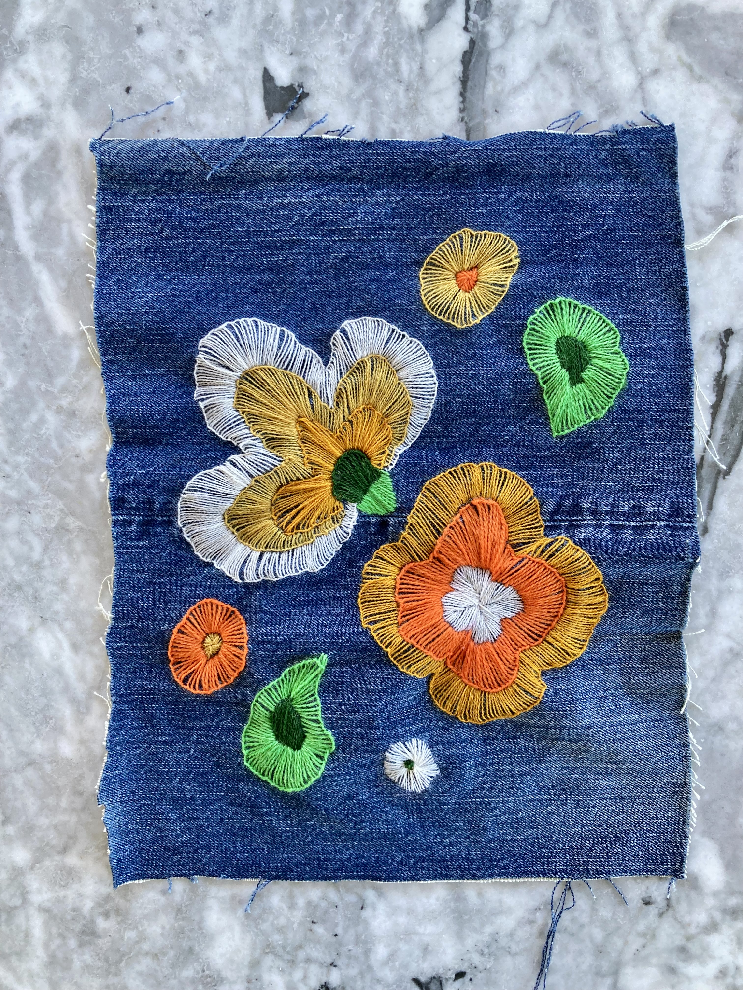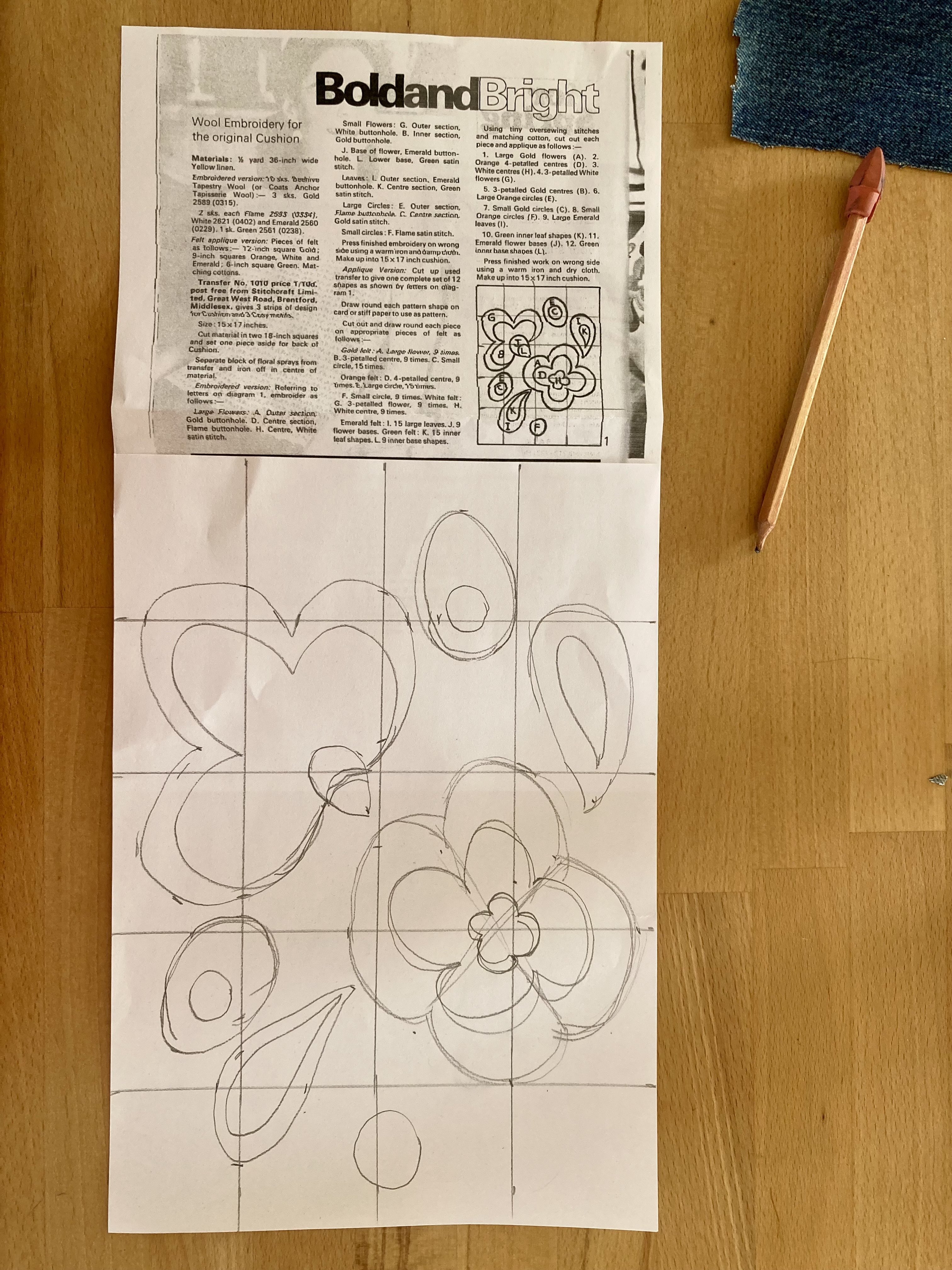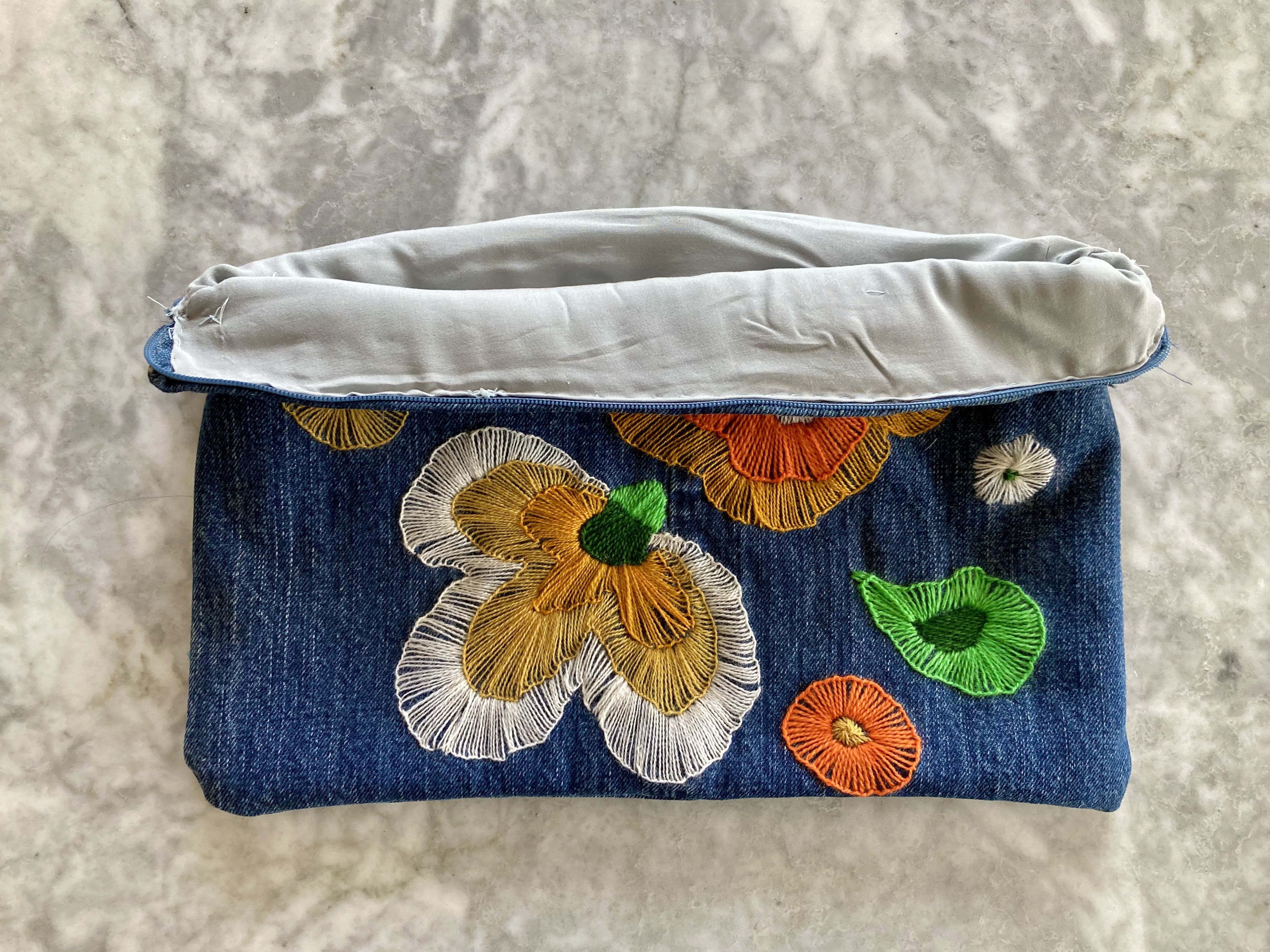 In keeping with the spirit of upcycling / using up scraps before buying new products, I decided to make the embroidered version, since I had some wool embroidery thread in the appropriate colours (gold, orange, white and two shades of green) left over from other projects. I had lots of appliqué felt too, but not the right colour scheme. Still had plenty of denim from an upcycled pair of jeans (original would have been yellow furnishing linen), lining fabric from the fabric drawer and quilt interlining for padding. All I needed to buy was a spool of thread and a zipper.