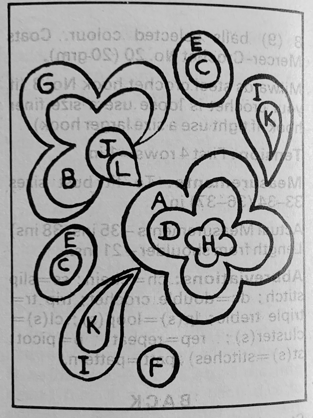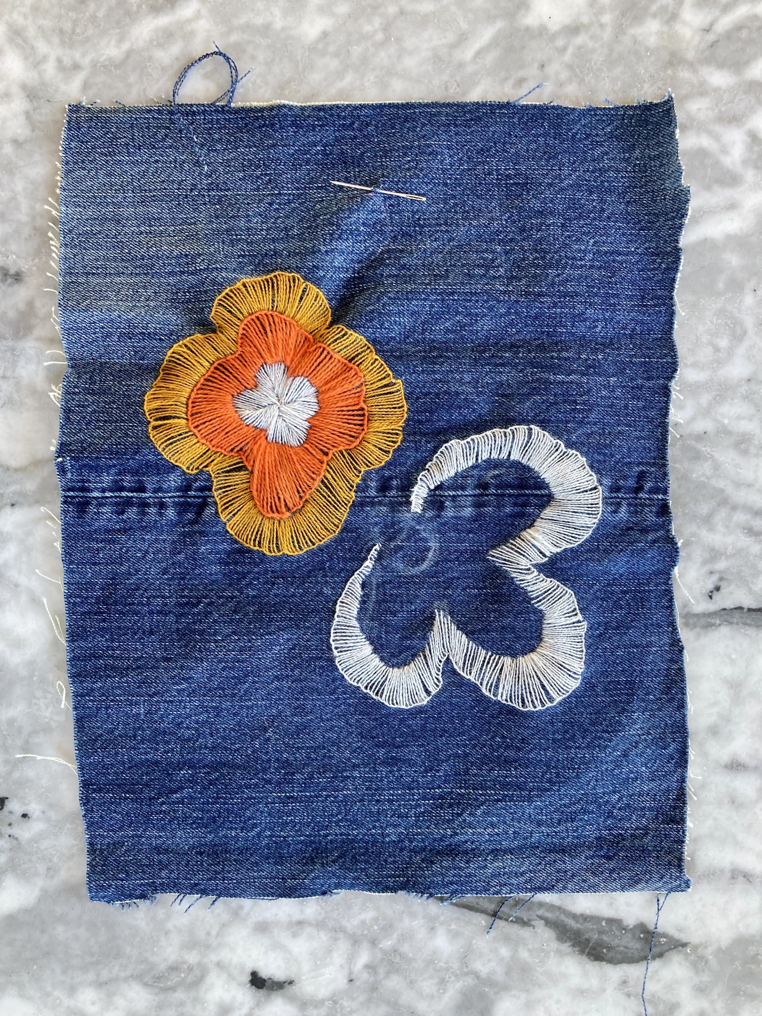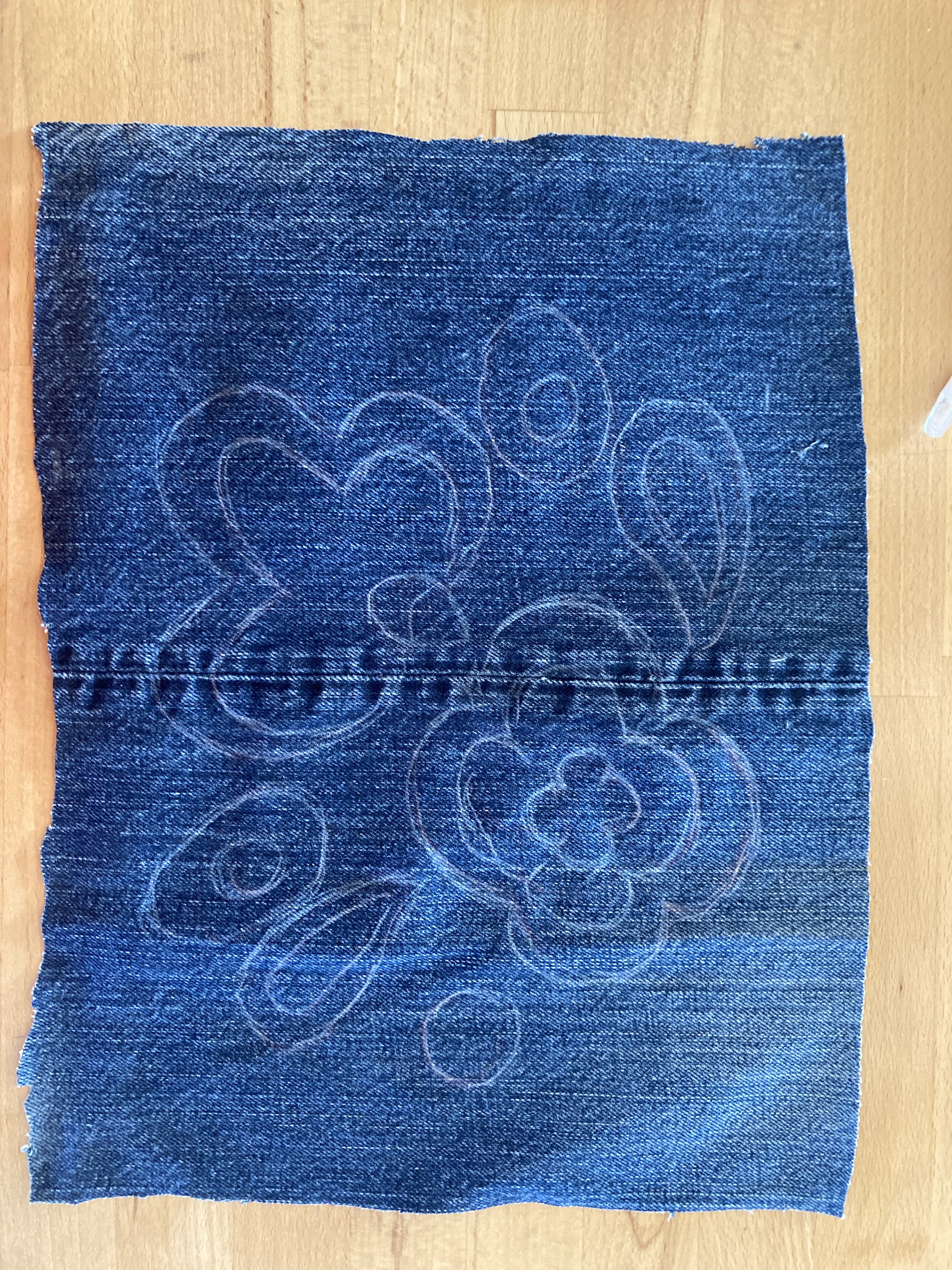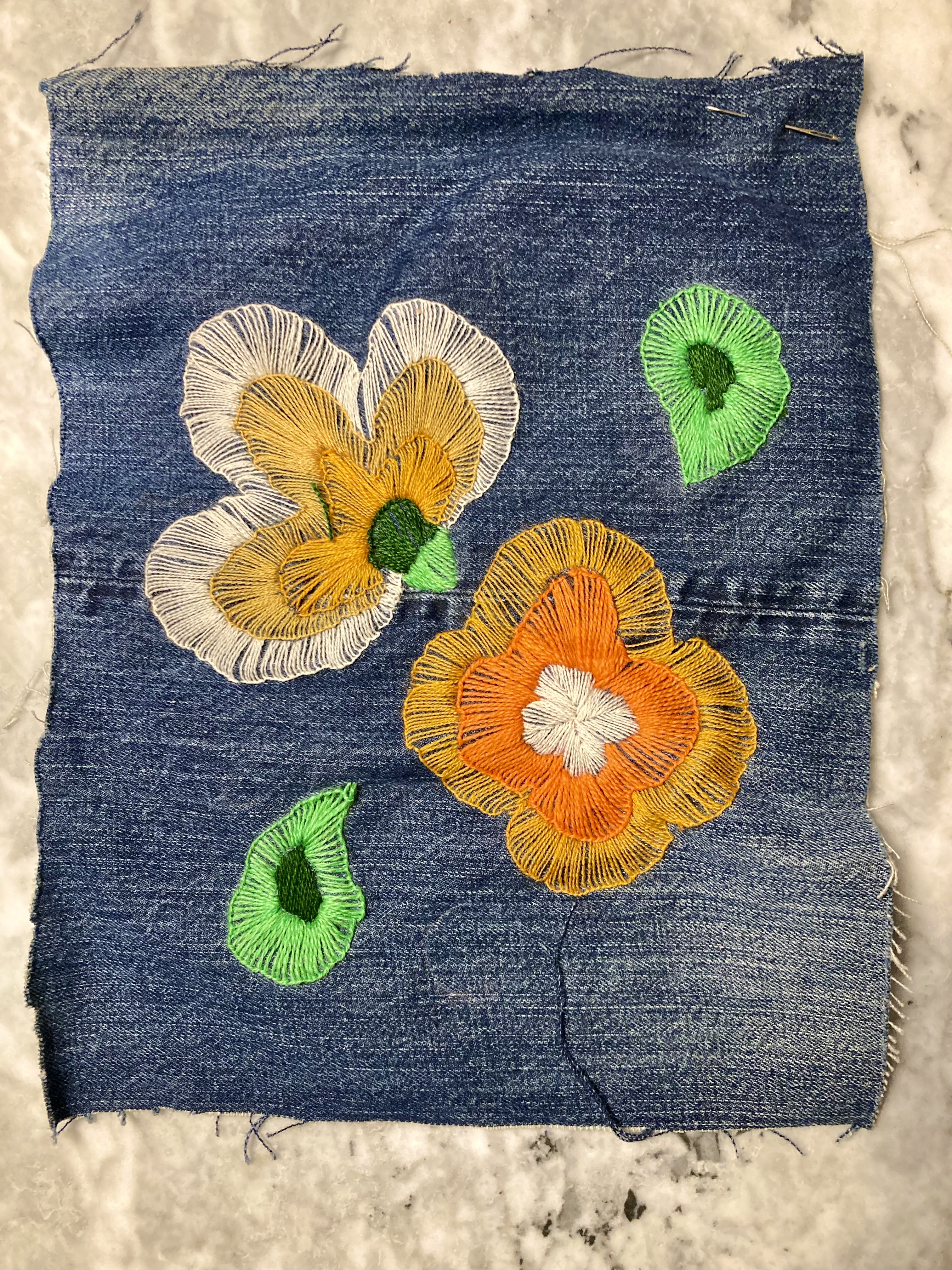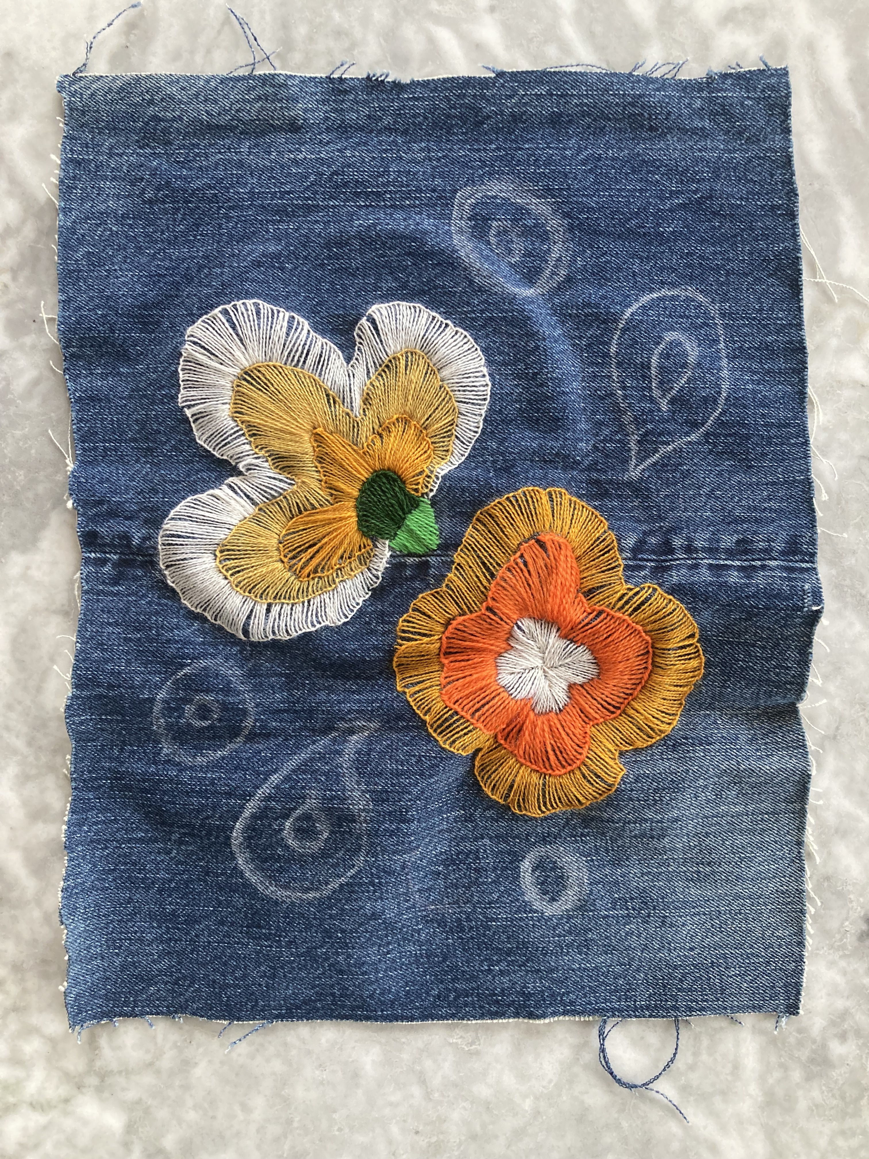 Als always, I would have had to send away for the transfer in 1968, but there was a helpful schematic in the magazine which I transfered over to paper and then onto the denim, sizing it up to fit. Transfering the design to the denim was hard, even with a white tracing pencil. I had to go over it with chalk and then of course keep going over it again and again because the chalk wiped off during the embroidery. One of these days I will try using solvent paper.