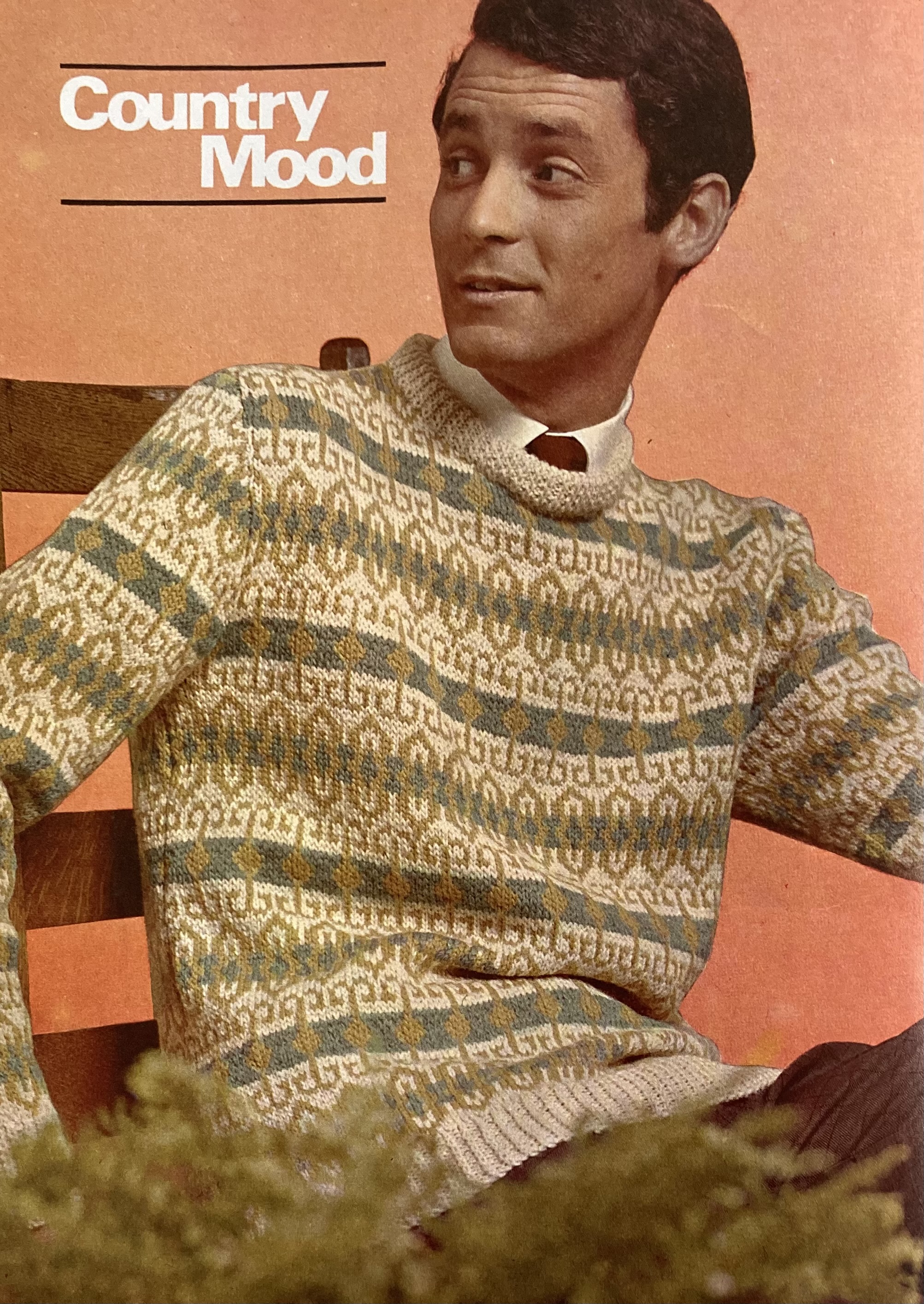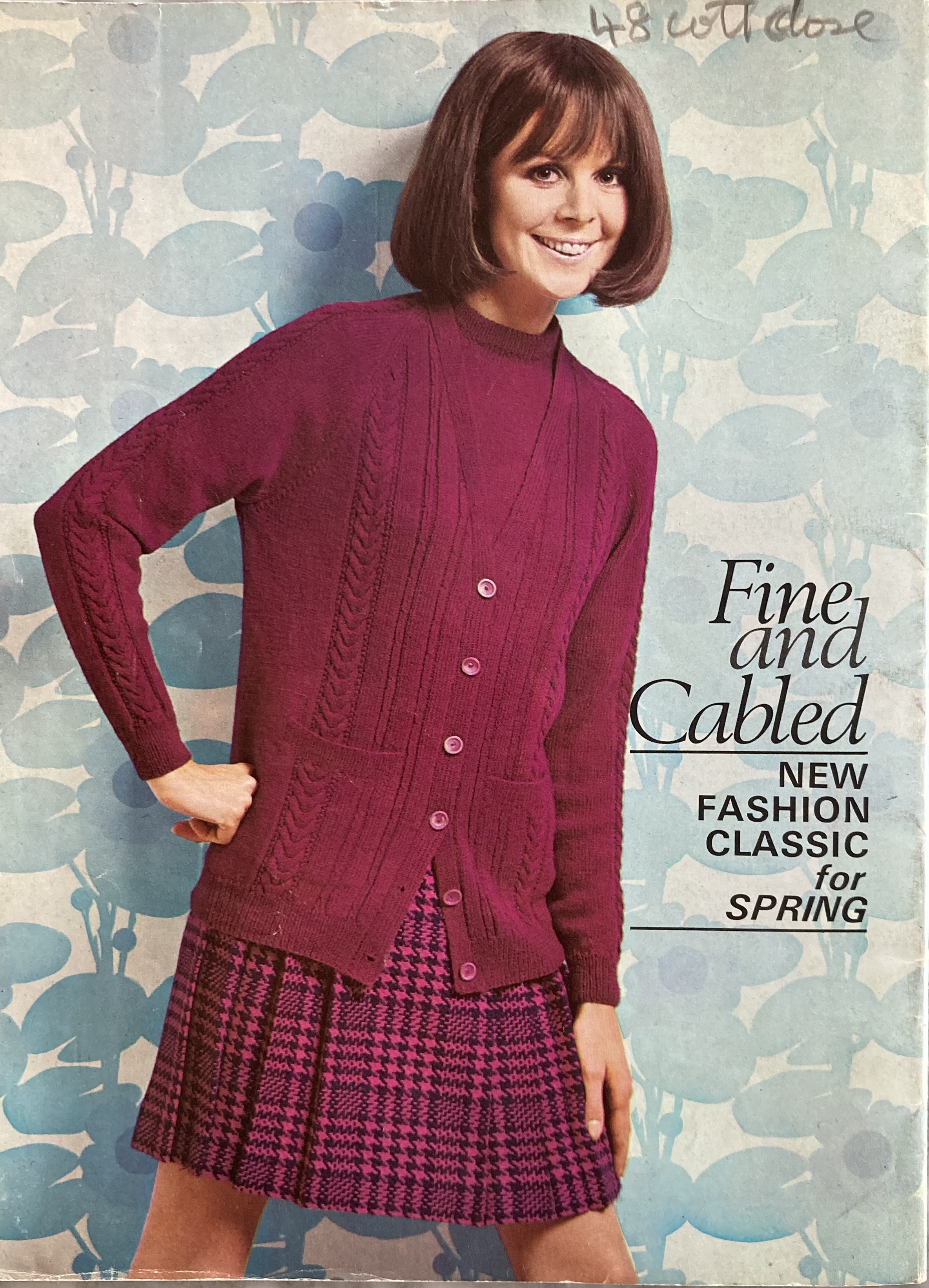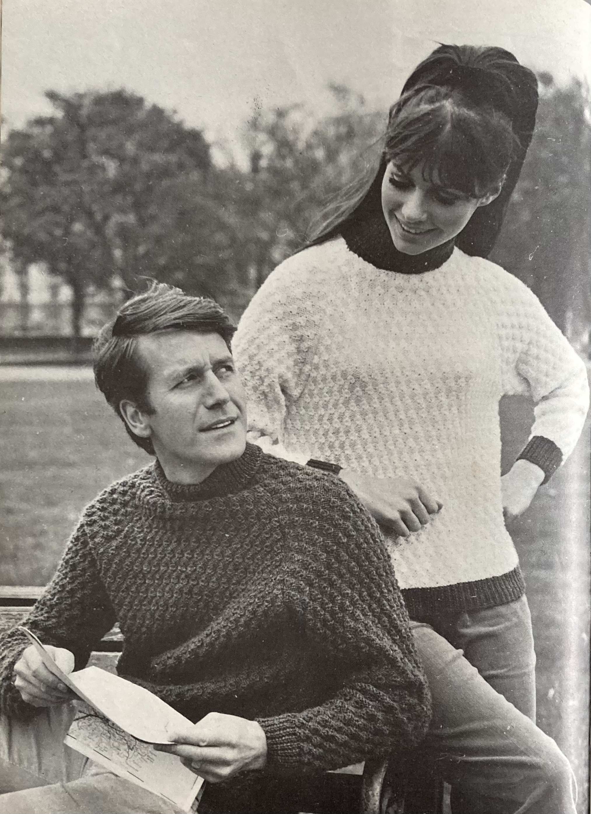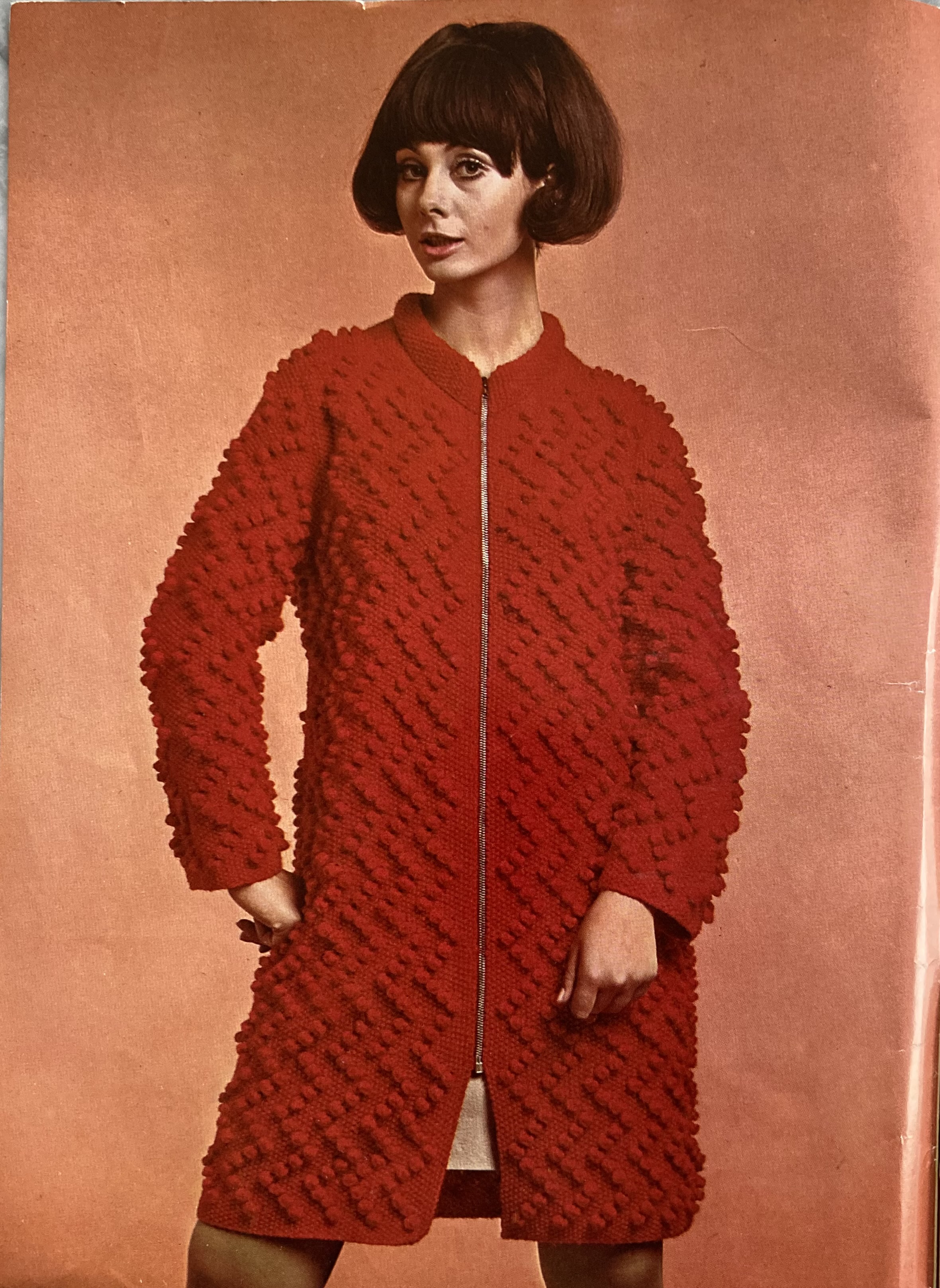 The cover design is a lightweight, but presumably warm pullover in a leafy lace-panel pattern and Patons “Princess” yarn (85% wool, 15% angora.) It’s slimmer, longer, high-necked, and belted — trends that will continue throughout the year. The back-cover design is a twin set in late 60s style, loose-fitting and worn with a kilt-like plaid skirt. It, too, is touted as a “long-liner” and the caption says it can be “belted if you like.” There’s a similar long-and-slim feeling to the “Country Mood” set on the inside back cover, which features a zipped cardigan over a mini-skirt, both in really interesting two-colour trellis pattern. The pattern looks like it would be made with slip-stitches, but is in fact stranded, with twisted stitches to give the trellis effect. Longest of all is the amazing bobble-stitch coat on the inside front cover, weighing in at a whopping 50-54 ounces and similarly zipped up the front.