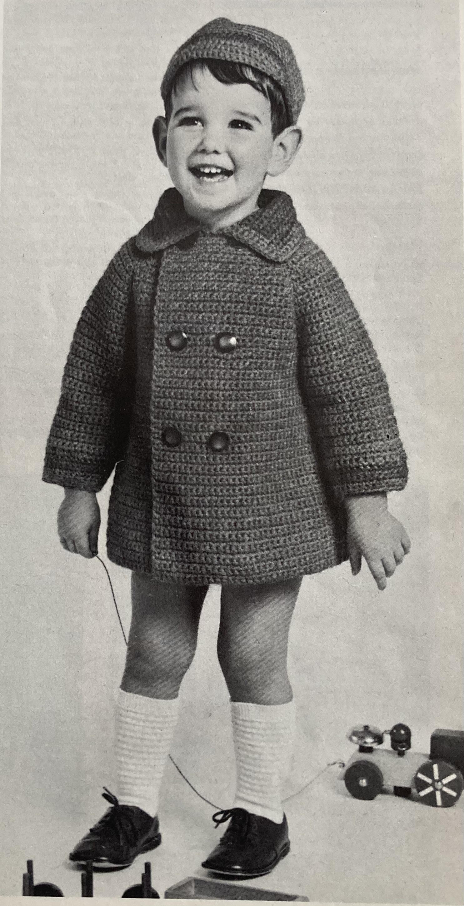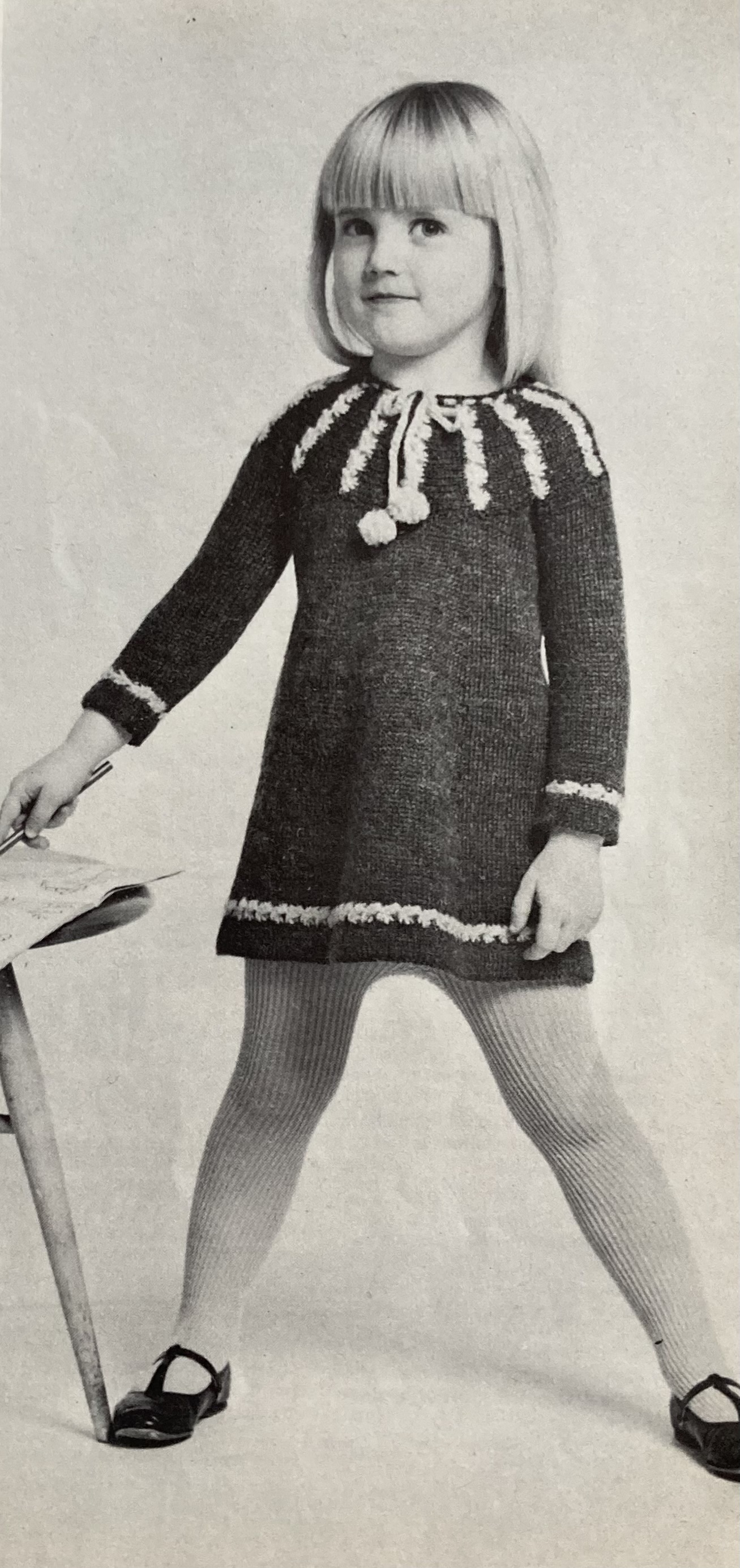 There are three patterns for children of different ages in this issue, starting with a coat-and-cap set for a little boy. I suspect he’s only looking so happy because he’s in a warm photo studio; if he ever actually went outside in that outfit, both his legs and his ears would freeze right off. I know if was customary to dress little boys in shorts at the time, but this poor kid doesn’t even seem to have those! How on earth is he supposed to play in the snow with a practically bare bum? At least the little girl gets to wear tights with her mini-dress/tunic this time, and since it is “for visiting”, I assume she will be wearing it inside. The circular yoke of the tunic is knitted horizontally and sewn on, and the white stripes are made by dropping stitches and picking them up later. The third design is a great indoor-outdoor sweater for a slightly older child, in thick “Capstan” wool and a twisted-stitch pattern that presumably acts as s sort of thermal blanket to keep warm.