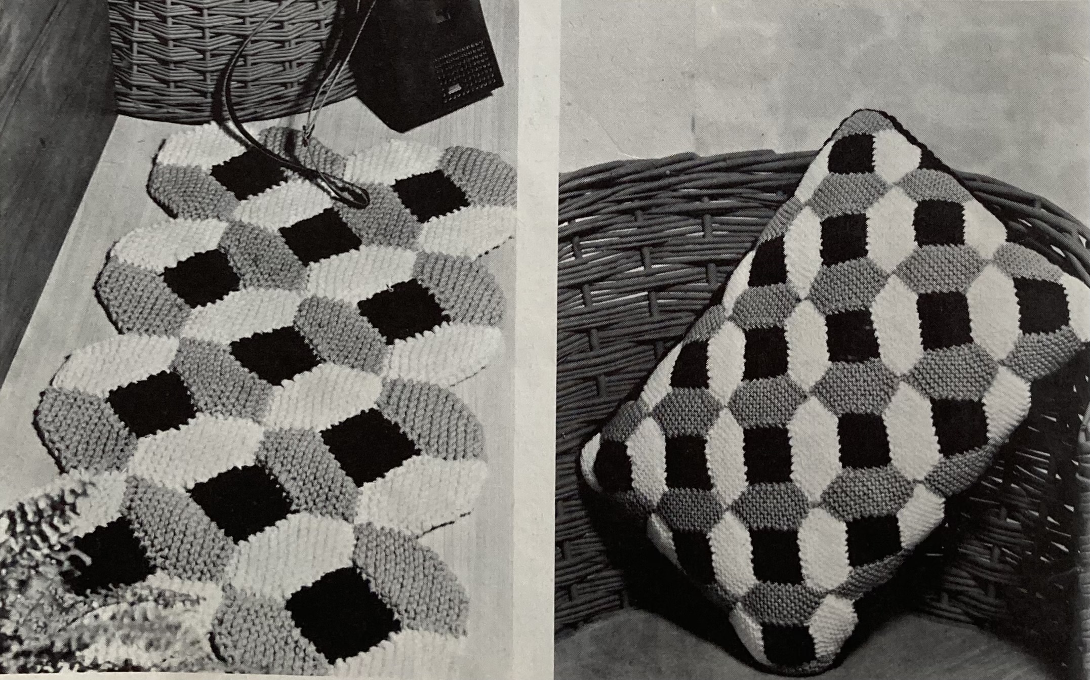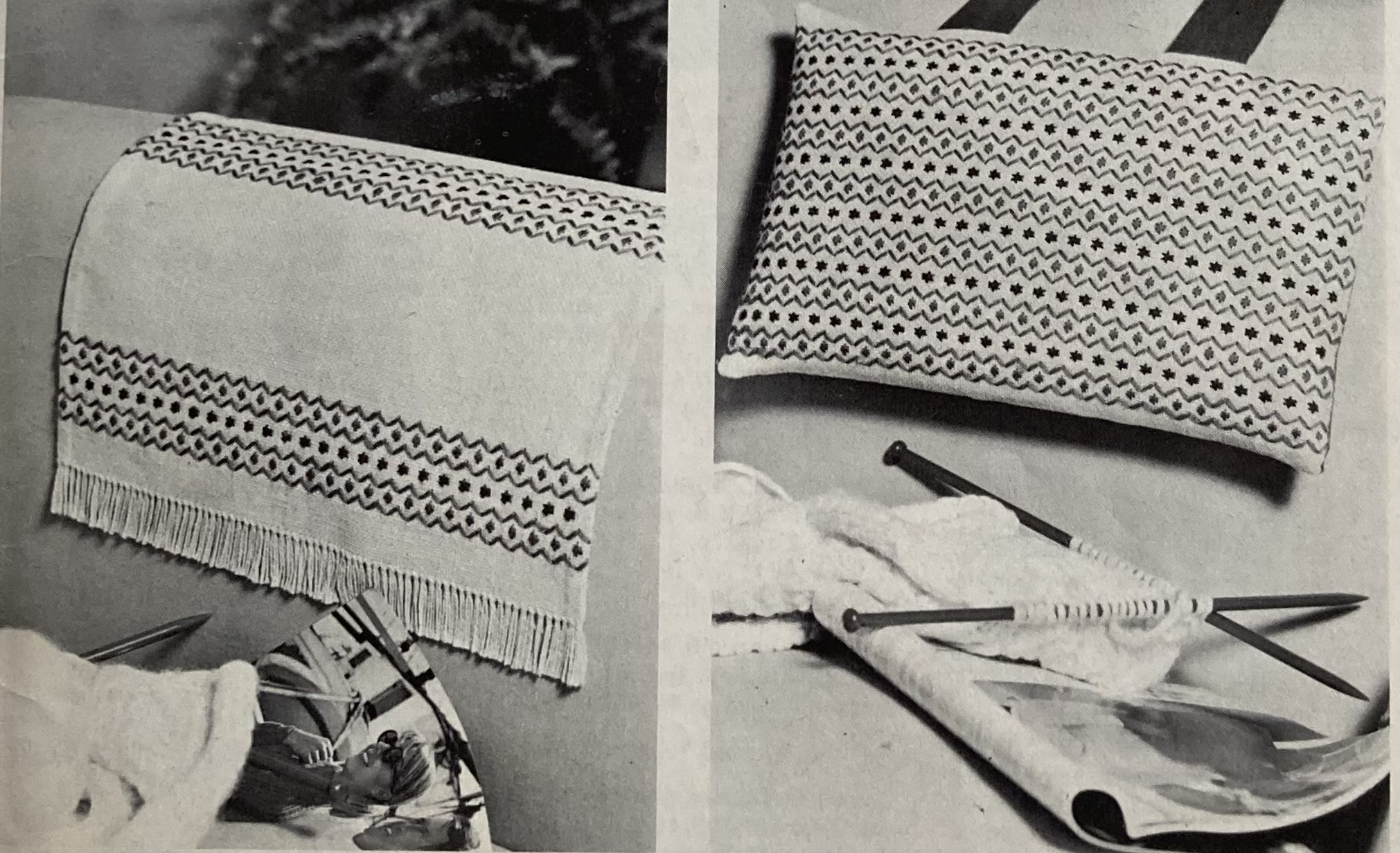 Most of the housewares in this issue are advertised as “Easter Gifts”, though I see no connection to the the patchwork rug and cushion, or the embroidered cushion and chairback.