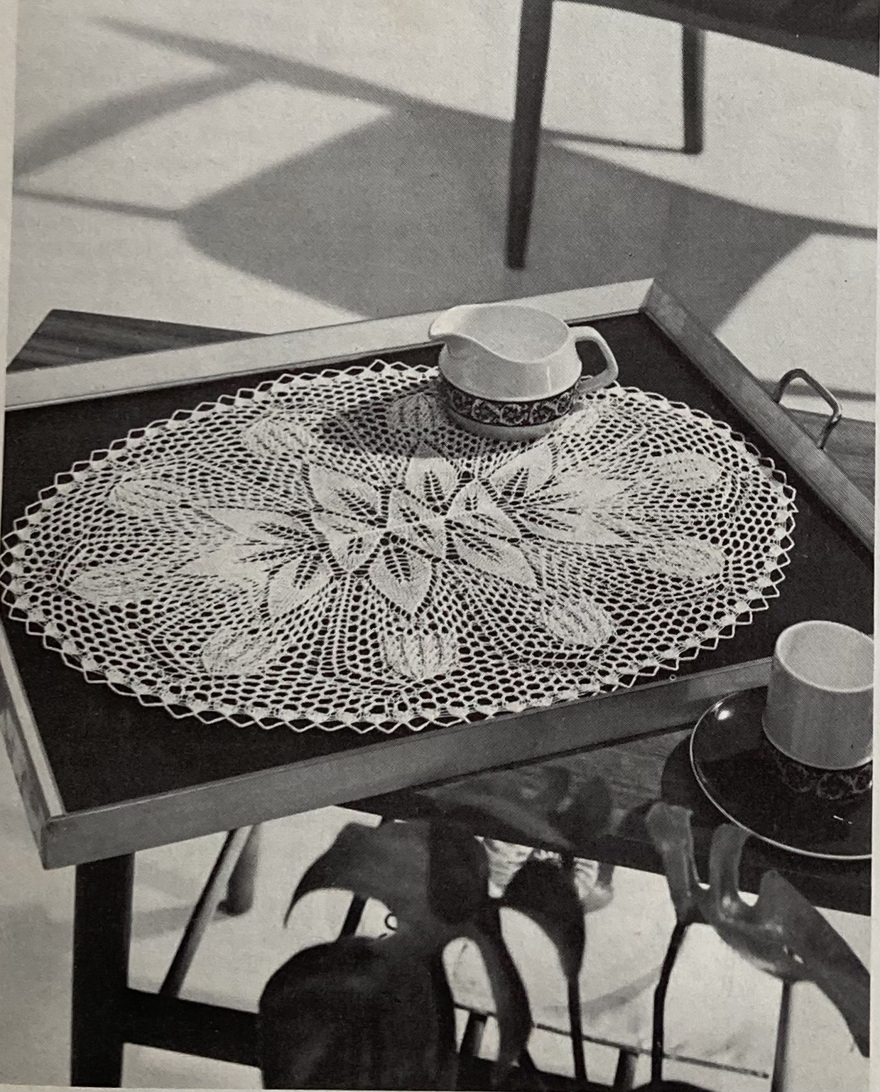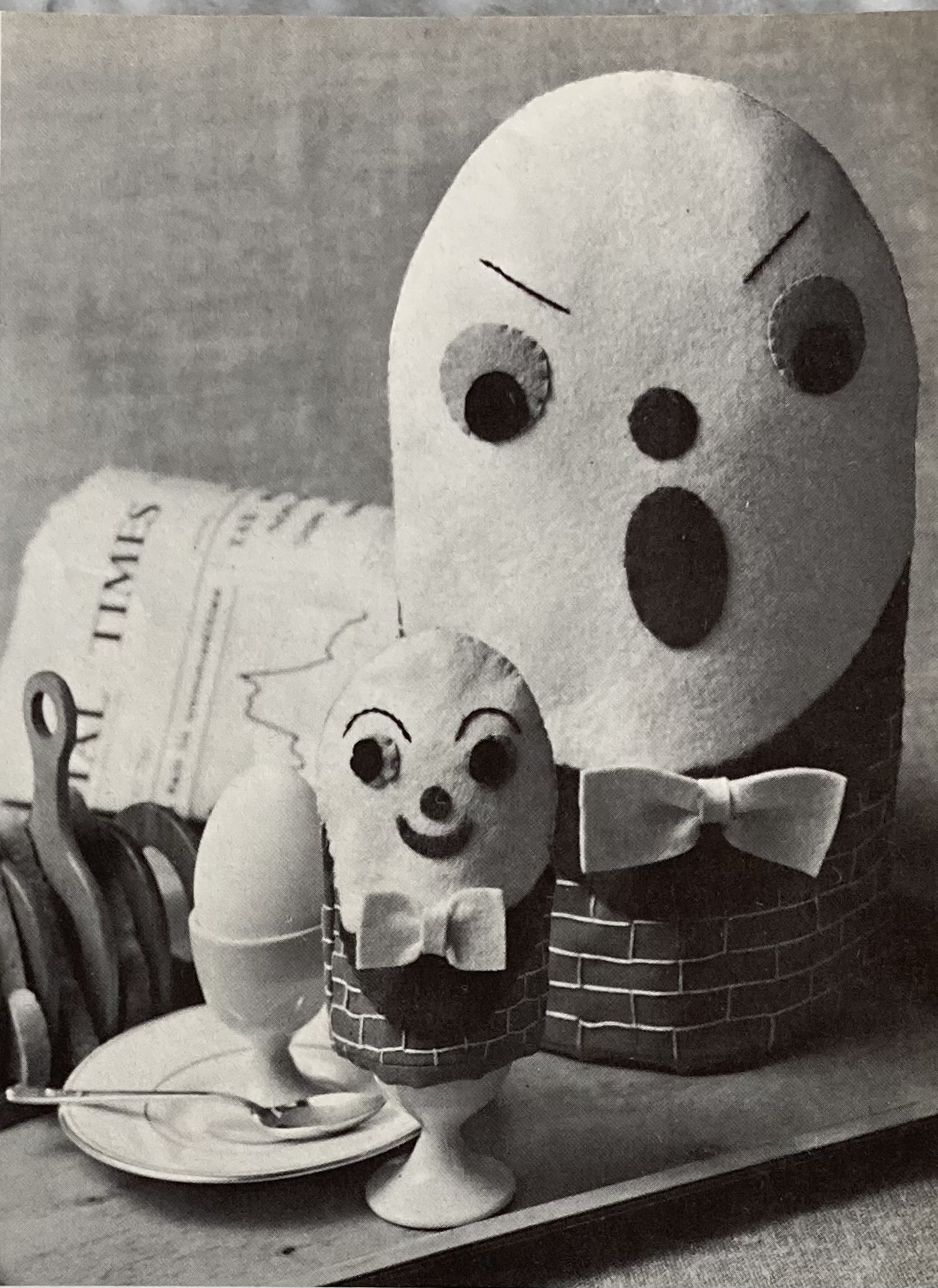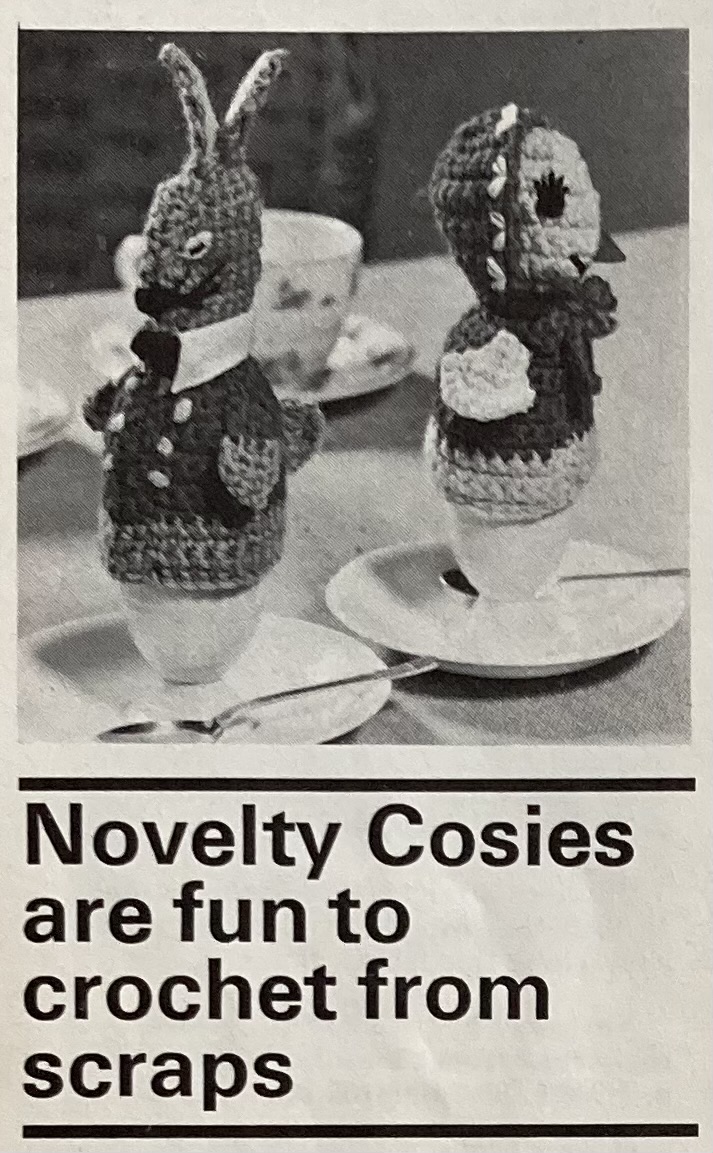 The elaborate crocheted or knitted doilies as well as the knitted tea cosy have floral patterns, but still no real connection to the holiday. I guess the “Humpty Dumpty” coffee-pot and egg cosies could accompany your Easter breakfast, if they don’t put you off it entirely! Stitchcraft is obsessed with Humpty Dumpty. Over the years, there have been egg cosies, stuffed toys, Christmas tree ornaments… I admire the creativity and the artistic commitment to a theme, but I do wonder. If you know why the egg cosy is happy and the coffee pot is angry, please tell me in the comments!