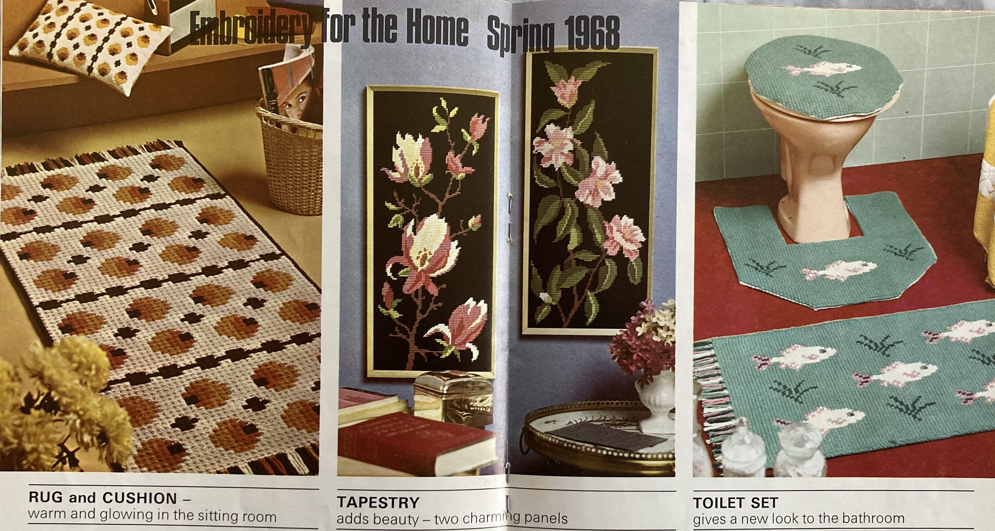 They apparently gave up on the Easter theme by the middle of the issue and just promise “4 pages of Rug-making, Tapestry and Embroidery for the Home”, which appear exactly as promised. There’s an elegant tea-table set of cosy and cloth in rose-pattern embroidery, a rug and cushion in best 1960s shades of brown, orange and gold, two floral tapestry wall panels, and a “Toilet Set” of toilet cosy and two mats. In previous issues, such items were called a “Pedestal Set”. I guess by 1968, there’s less need to be euphemistic. (But still a need to put a cosy on the toilet cover.)