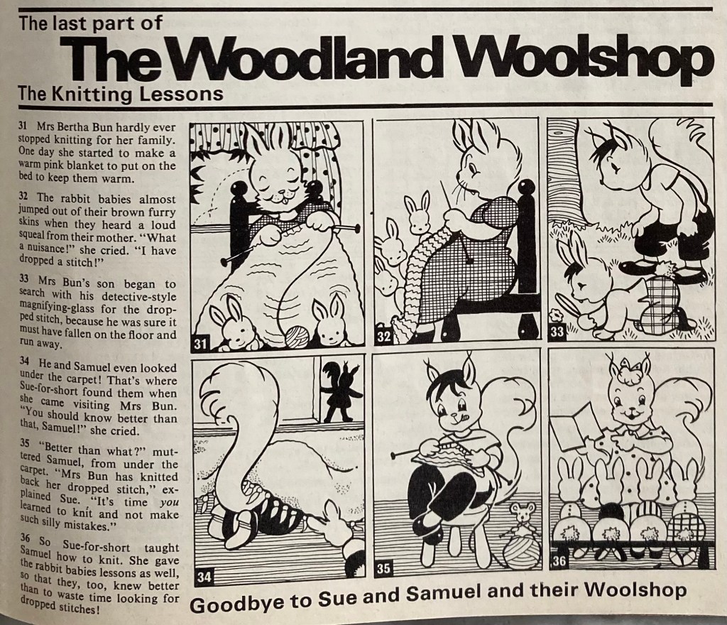 We have come to the end of our latest comic, “The Woodland Workshop”, in which various woodland animals learn that you cannot find a dropped stitch by looking for it on the floor! Words of wisdom, truly. I liked this comic.