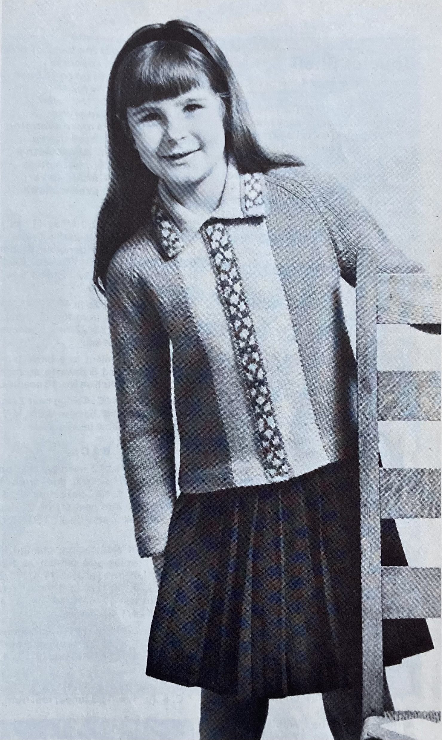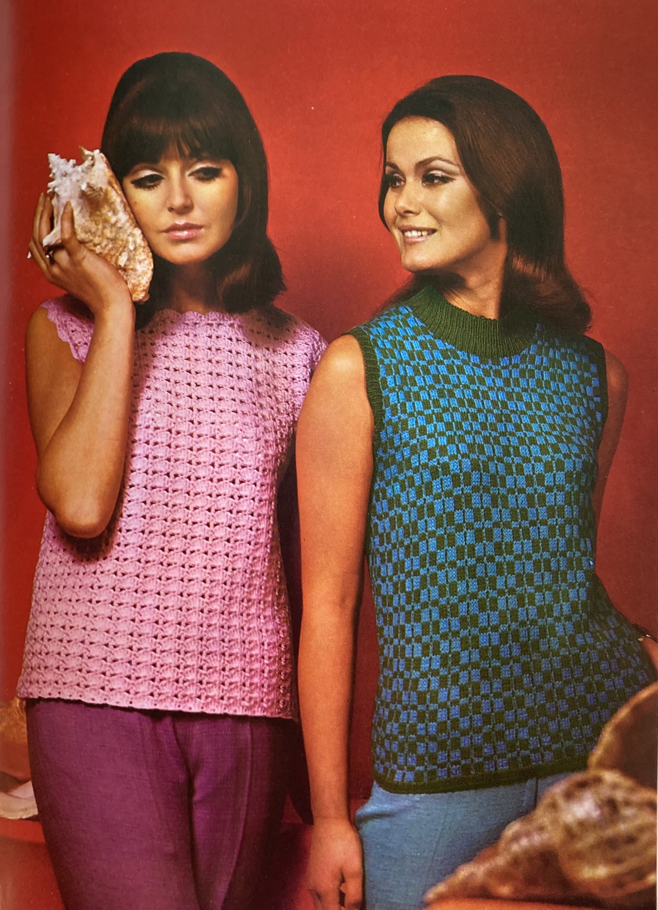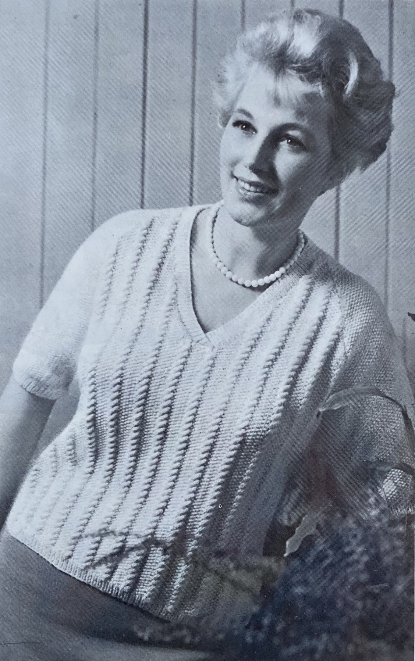There are some wonderful garments for children of various ages in this issue, starting with a comfortable bobble-trimmed top for a school-age girl and a warm sweater for a boy (make sure he’s wearing a proper shirt and tie to go under it while sailing his wooden boats at the beach.) Here too, the stitch pattern looks more complicated than it is: k1, p3 for one row, then p1, k3 back makes a interesting offset rib with minimal effort. Little kids can “paddle and splash” in a tunic, t-shirt top and/or shorts for beach wear. The horizontal stripes are knitted in and the vertical stripes are crocheted on later with chain-stitch. A note in the tunic pattern says, “We have allowed 1-inch extra in length on back and front of dress as chain-stitching tends to contract the work.” Smart!