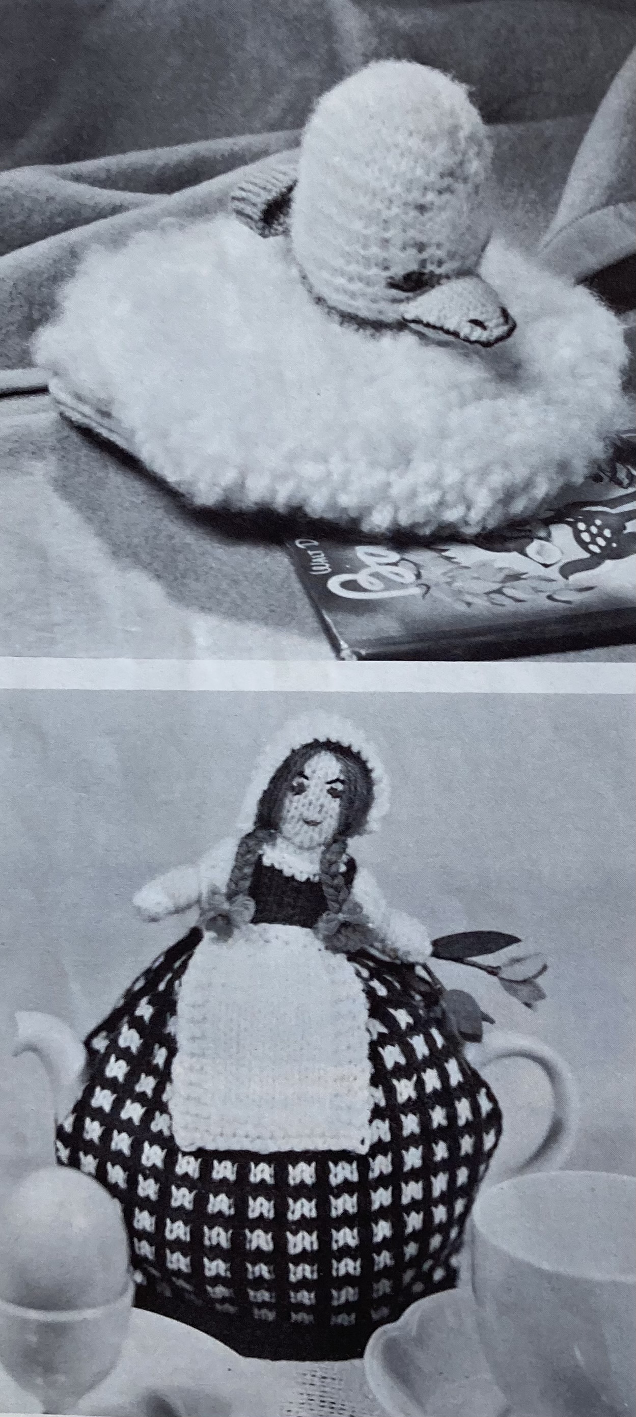 This is definitely a “cosy of unusual charm”! (Despite the ripped corner on the back cover photo.) It features appliqué and embroidery with different designs on each side and instructions to make it up into either a regular cosy to put over the teapot, or a “nest” to put the teapot into.
