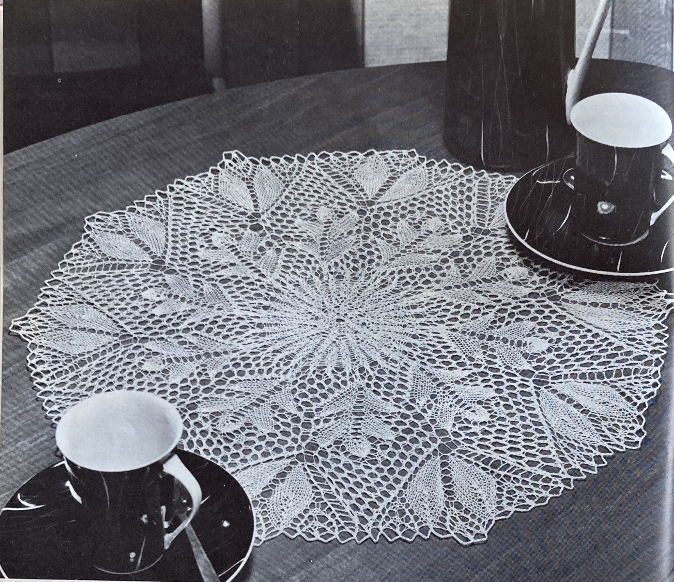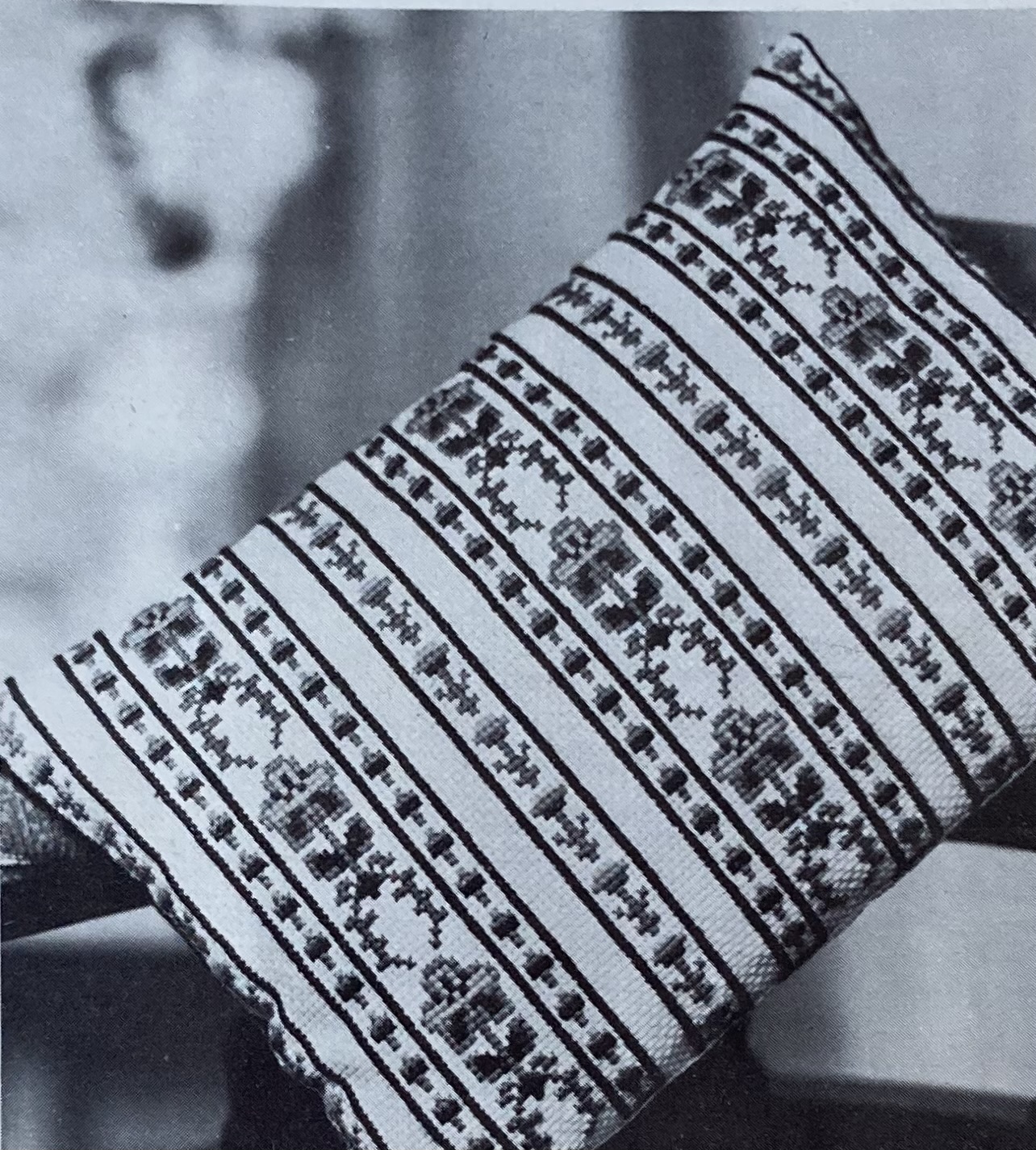 The most magnificent design, though, is this Chippendale-inspired rug and piano-stool set, rightly featured in full colour over the two centrefold pages. The stool cover is worked in tapestry using tapisserie wool in trammed tent stitch and the 36×62 inch rug is worked in cross-stitch in Turkey Rug Wool.