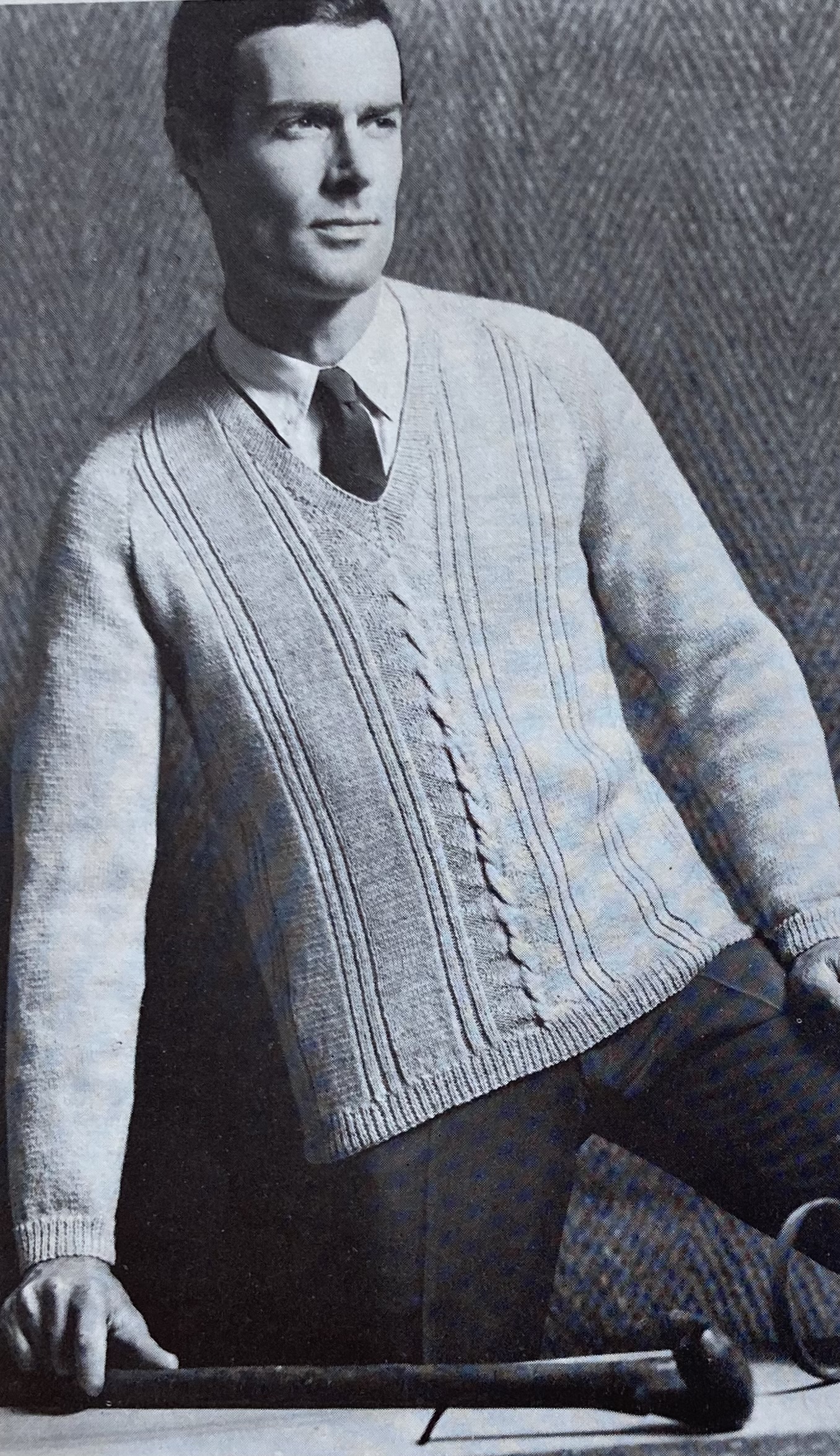 It’s a good issue for menswear too, with a lightweight slipover in a reversible (!) textured pattern. I thought the stitch pattern would be some sort of fisherman’s rib, but it is is utterly simple: knit 1 row, then k1b, p1 for one row. It looks like fairly normal 1×1 ribbing from the “right side” and a sort of starry waffleboard pattern from the “wrong side”. How lovely to never have to worry about putting something on inside-out! The “Continental pullover”, on the other hand, is too wide and the cables on the lower half give a strange “skirted” effect. Perhaps they knitted the wrong size, or should have put it on a larger-bellied model.