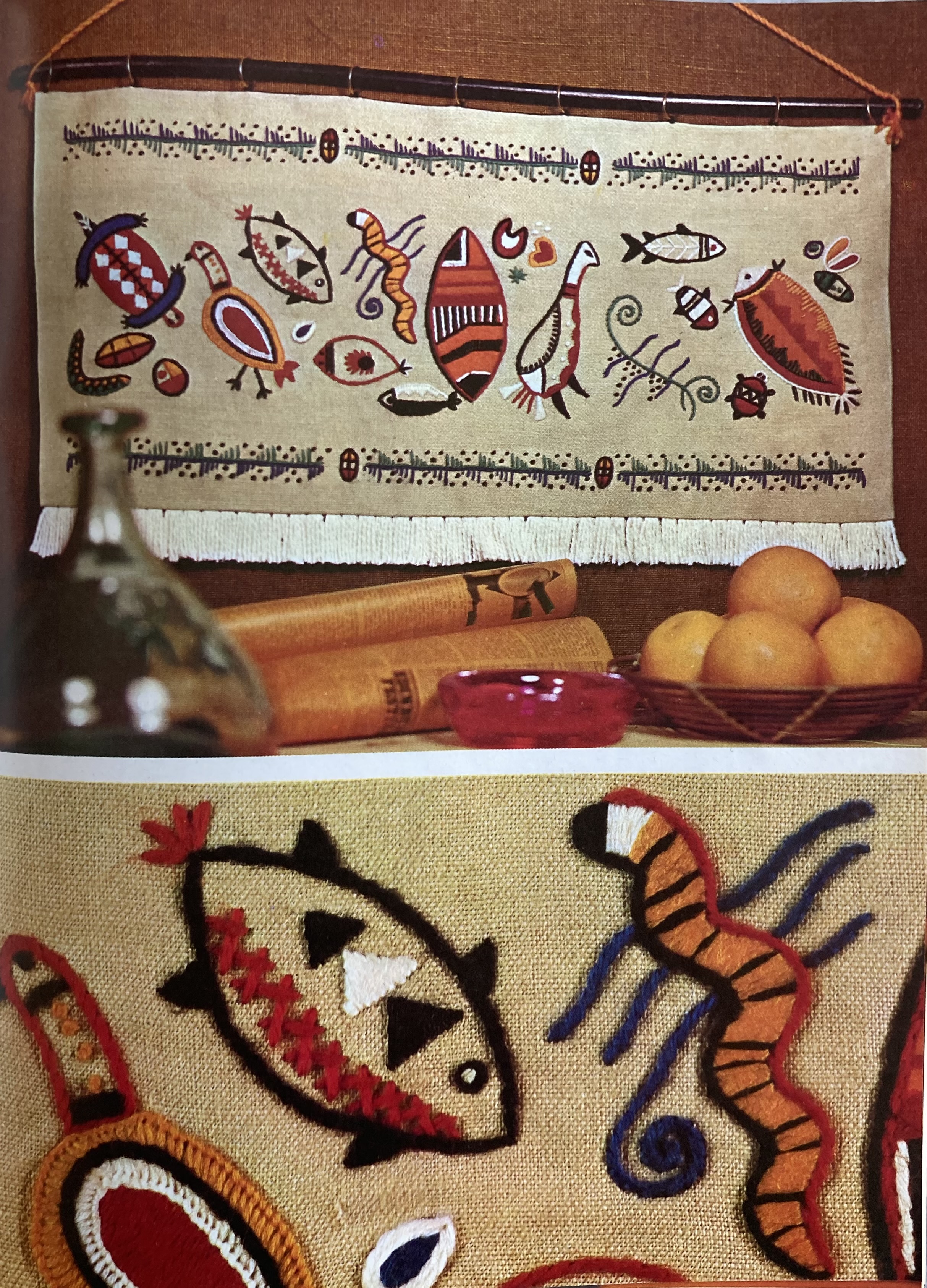 For cross-stitch enthusiasts, there’s a coffee-tray set with matching deep-pocketed apron, or a tea cosy featuring wool stitching on tapestry canvas. Beginning rugmakers can make an easy runner in chain and soumak stitch.