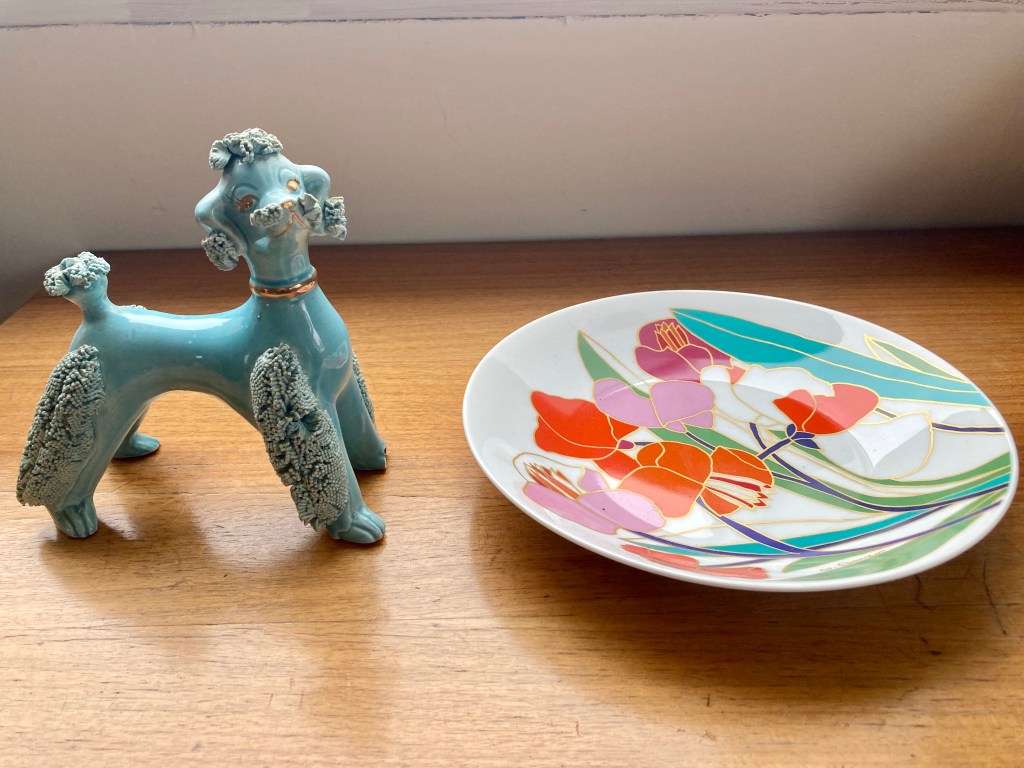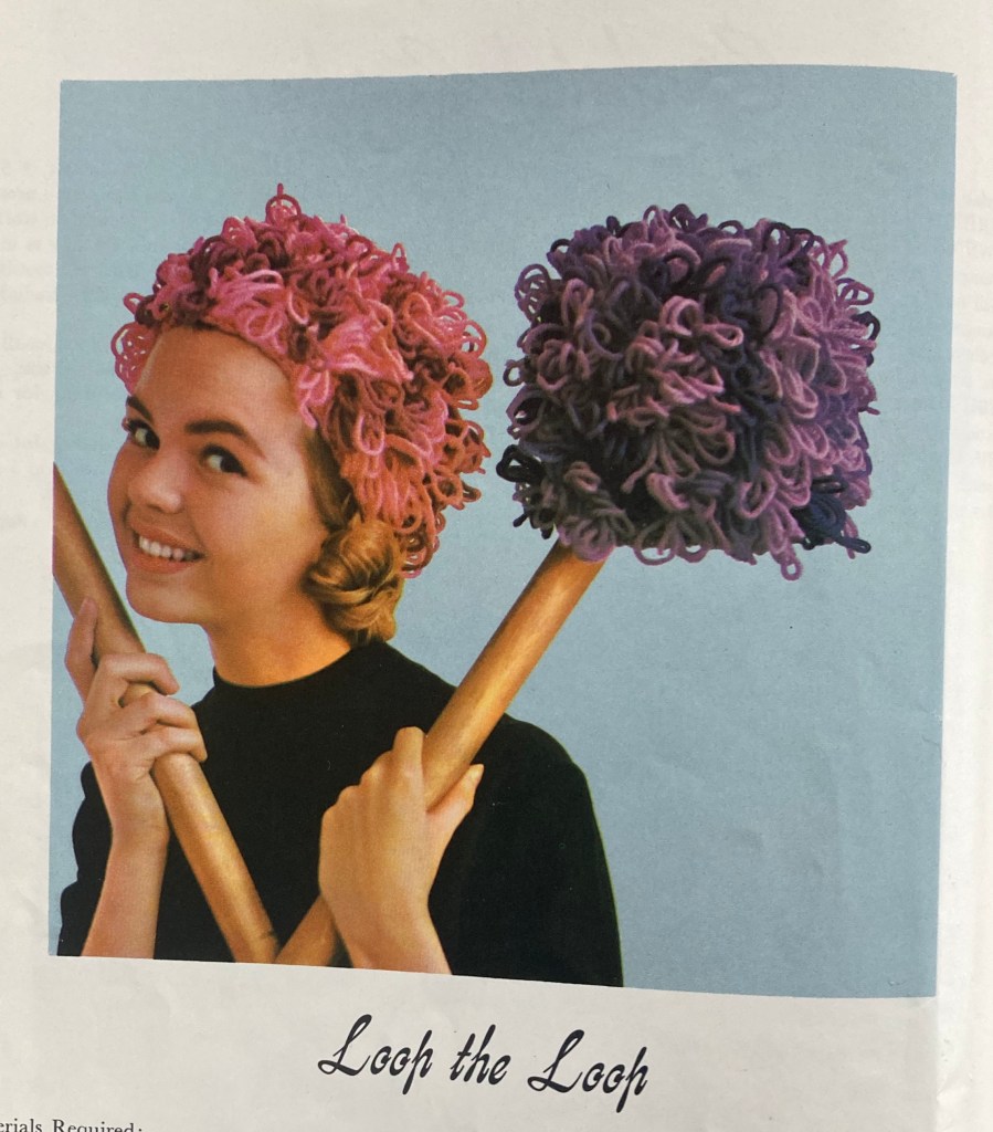 Homewares are fun and easy, starting with a knitted “World Cup Willie” car rug. The 1966 FIFA World Cup football (soccer) tournament was held in England in July 1966, and “World Cup Willie” was its official mascot. England won the trophy that year, beating West Germany in the final match 4-2, so I guess Willie was indeed a bringer of good luck. Personally, I am much more interested in the Stitchcraft model’s dress, hat and shoes than Willie or the World Cup — I want that entire outfit! The rug is made in heavy “Big Ben” wool and a sturdy moss-stitch pattern, with the “Willie” motifs worked in intarsia technique from a chart included in the magazine issue.