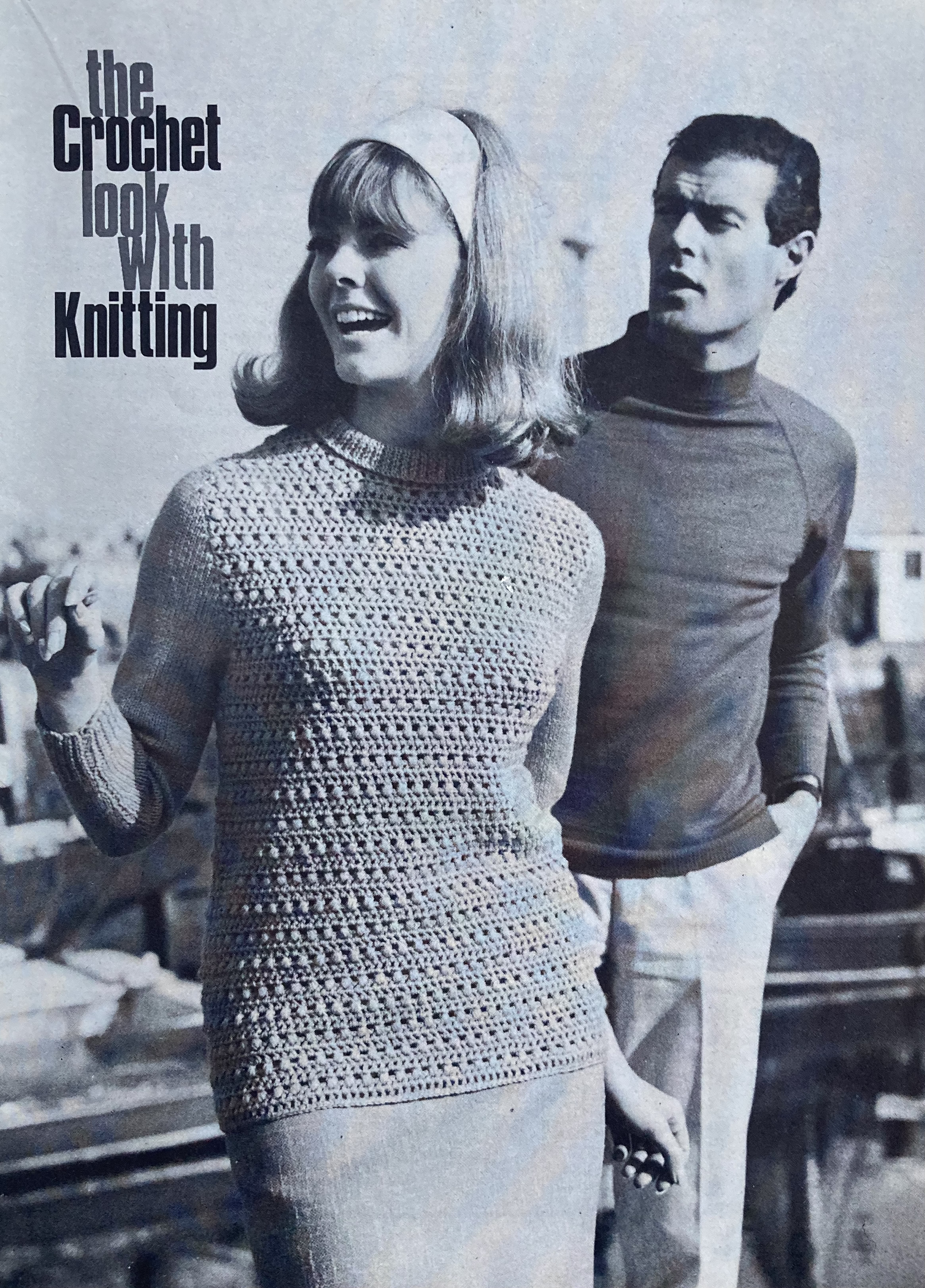 The cover ensemble brings back houndstooth, which never really goes out of fashion in the 60s, but was last seen in this form in the earlier years of the decade. It’s a clever choice for a skirt, as the fabric is fairly firm, preventing all too much sagging in the back. The set can be complemented by a wonderful pair of matching-pattern knee socks. Or you can achieve the lastest stitch-pattern trend, namely “the Crochet look with Knitting”, with a sweater that is… well, crocheted, for the most part. Only the sleeves are knitted, in plain stocking-stitch; back and front are crocheted in a bobble-treble pattern. The silhouette for both outfits is long and unshaped, but not baggy: the sweaters have set-in sleeves and high necklines and the skirt sits just above the knee.