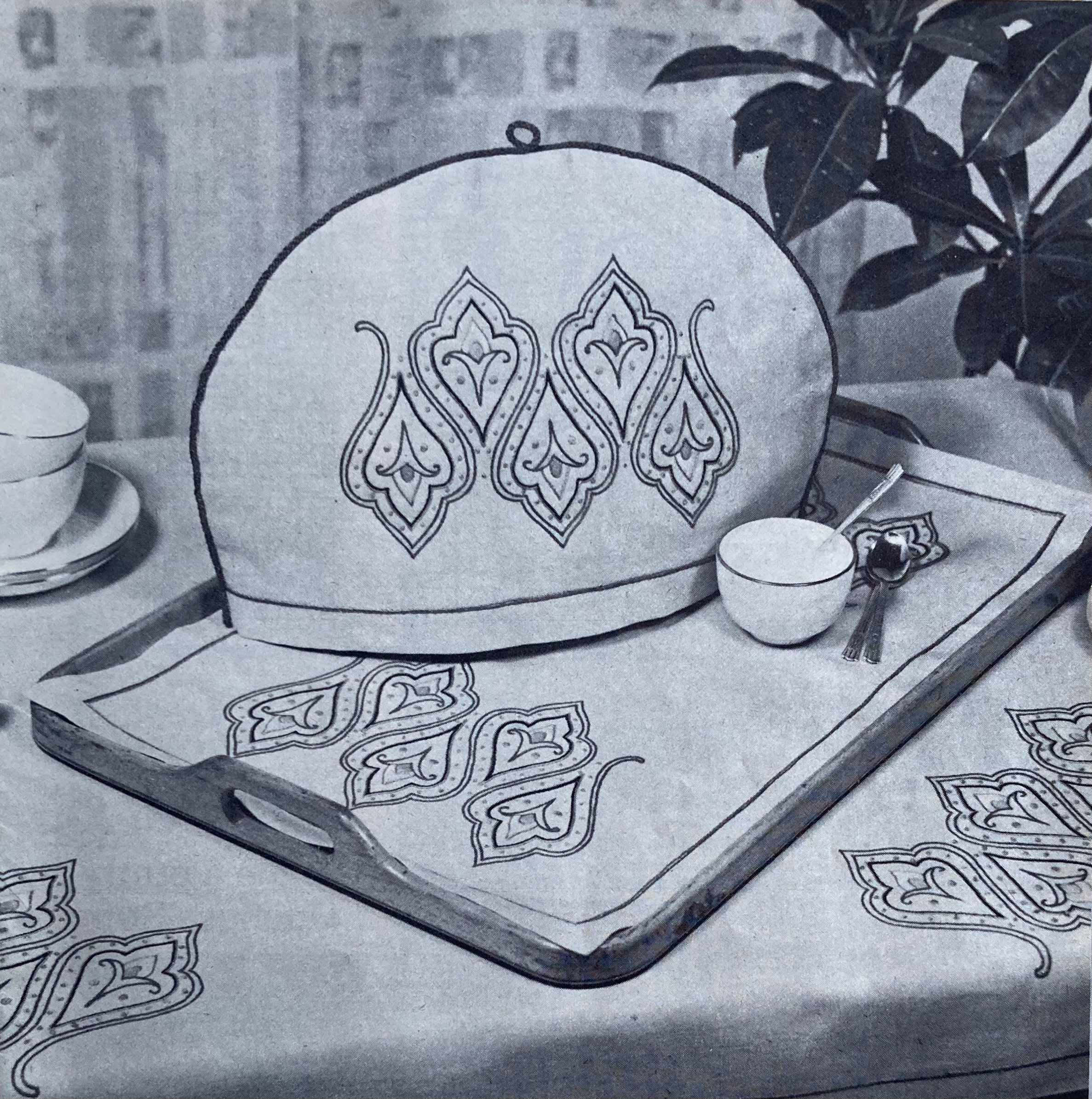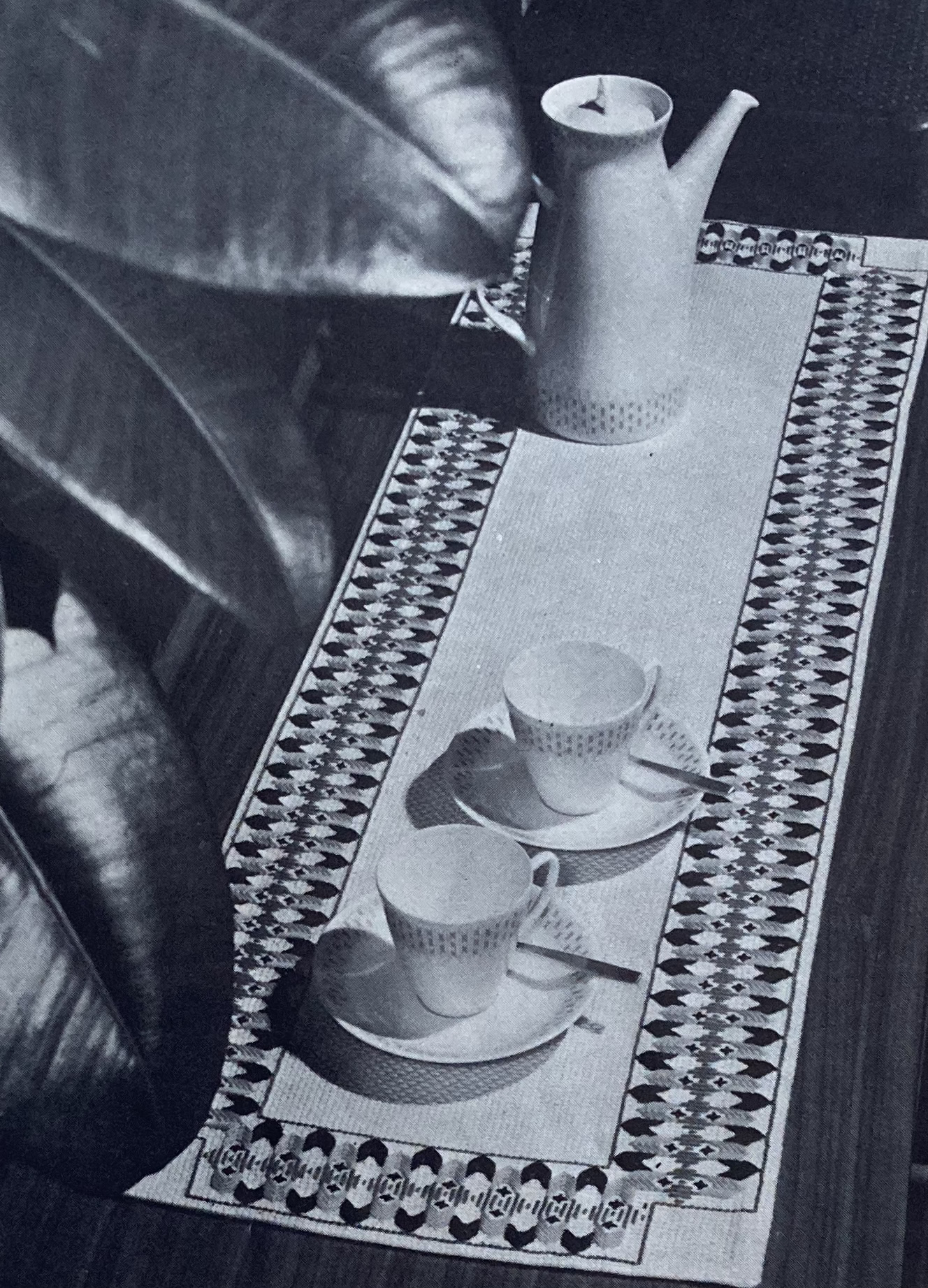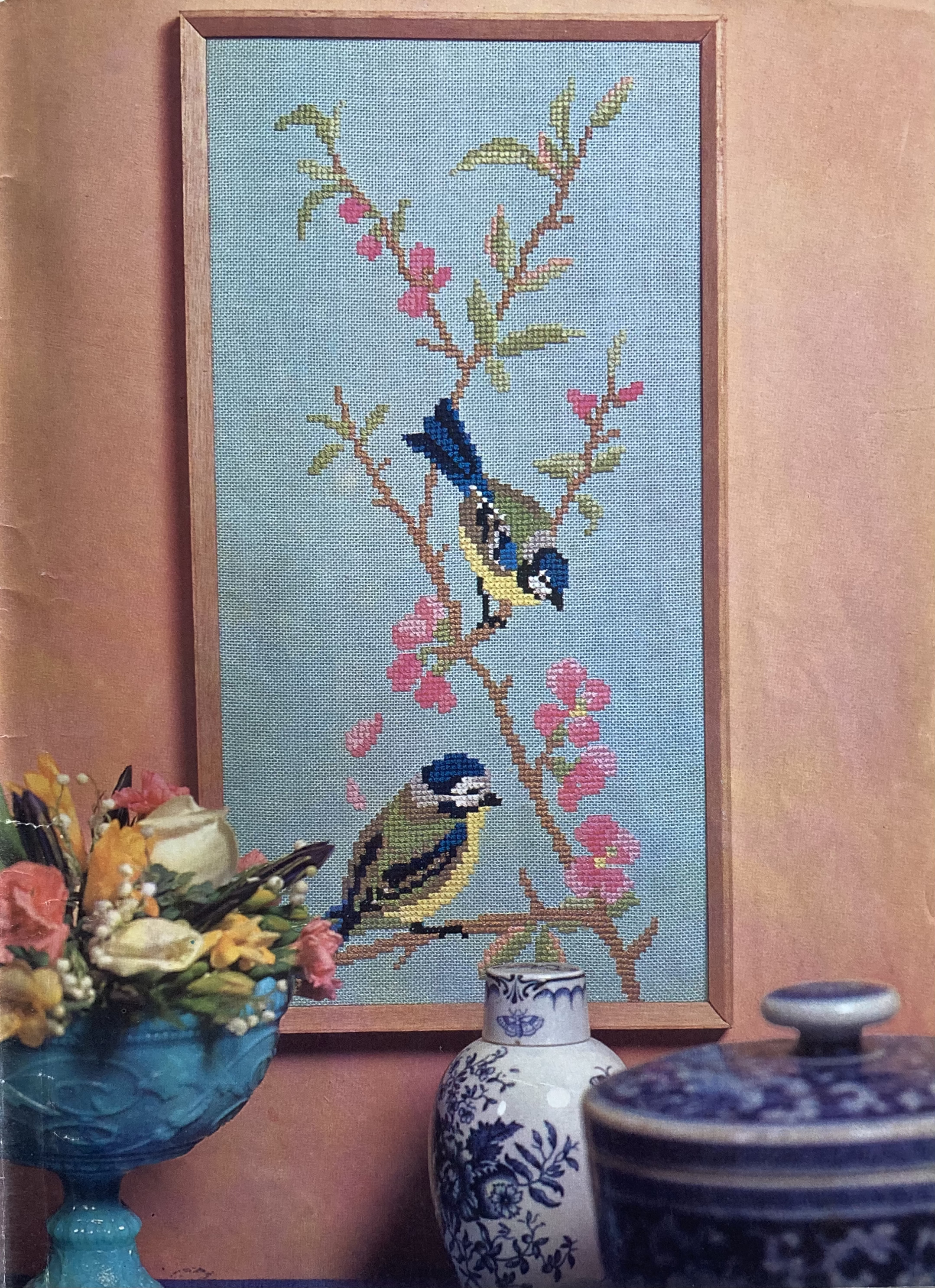 With all these great fashions, it’s no surprise that the homewares in this issue are a bit standard: embroidery for a tablecloth, tea-tray or cosy, embroidered dressing-table mats, or a runner for a Scandinavian-style long coffee table (in very 1960s colours of Tangerine, Coffee and Green), for example. Spring style shows itself best in the stitched rug in traditional floral design, or the birds-and-blossoms wall panel in cross-stitch.