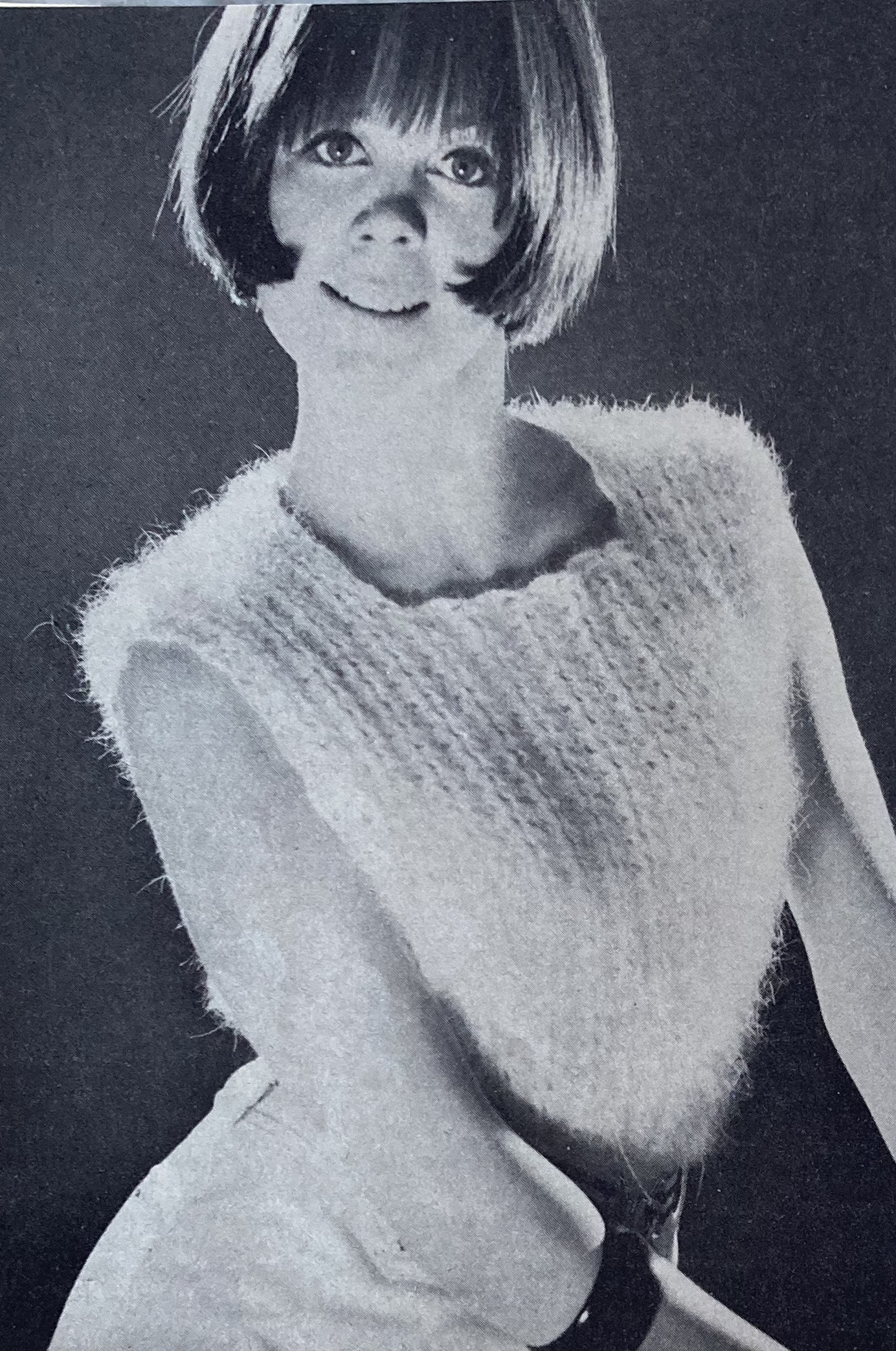 Anyway, enough soapboxing and doom. I’m sure you would all rather read about what readers in 1966 could make from this wonderful, evil new yarn! This issue uses it for a “fashion set of 3 garments”: the twisted-rib-and-eyelet pullover on the cover, a “casual dress” in a different type of twisted-stitch, and a sideways-knit pullover for men. All three feature bold and brilliant colours, a hallmark of early acrylic fabrics and in keeping with the bright, fun vibe of a mid-60s spring.