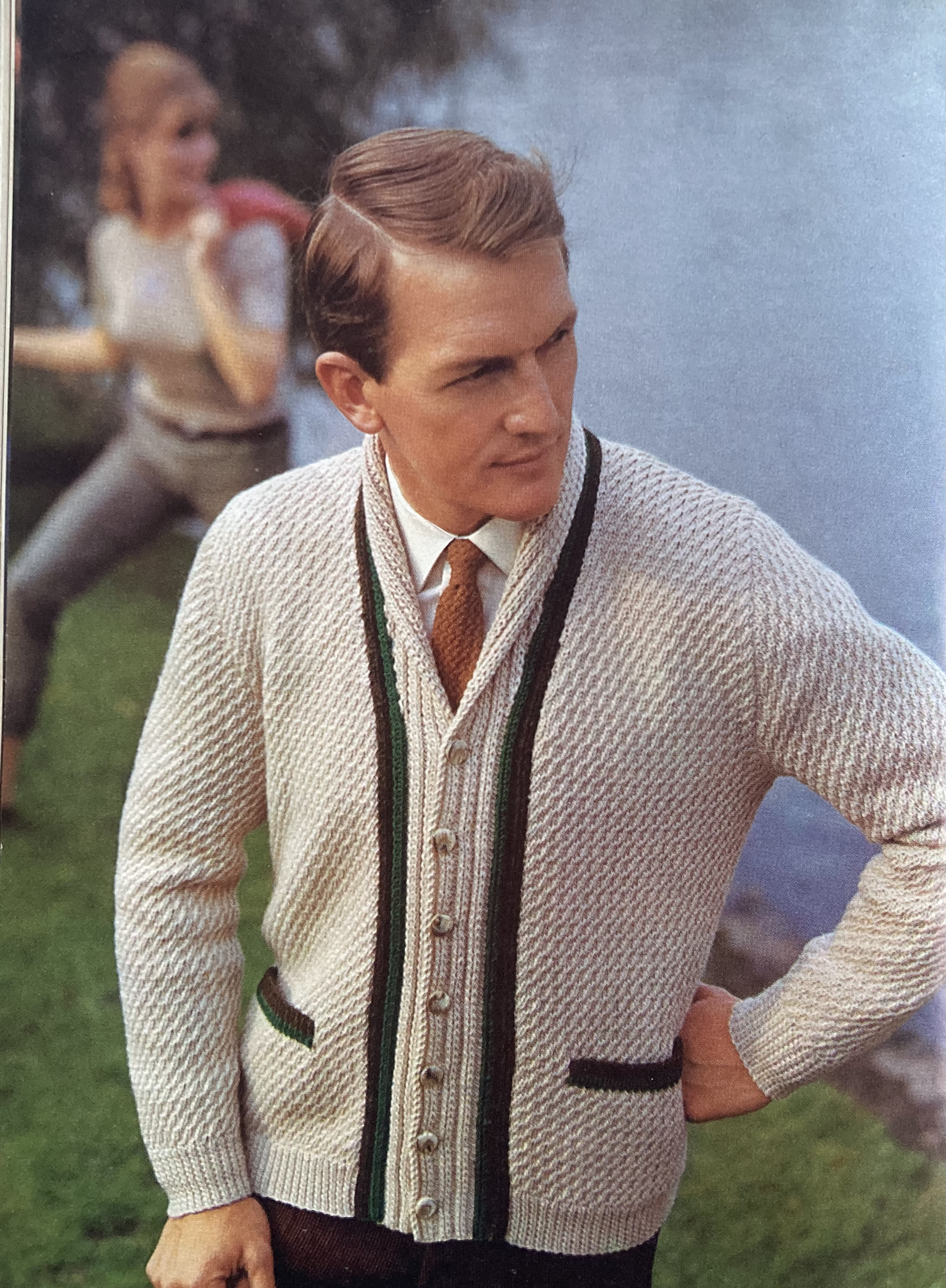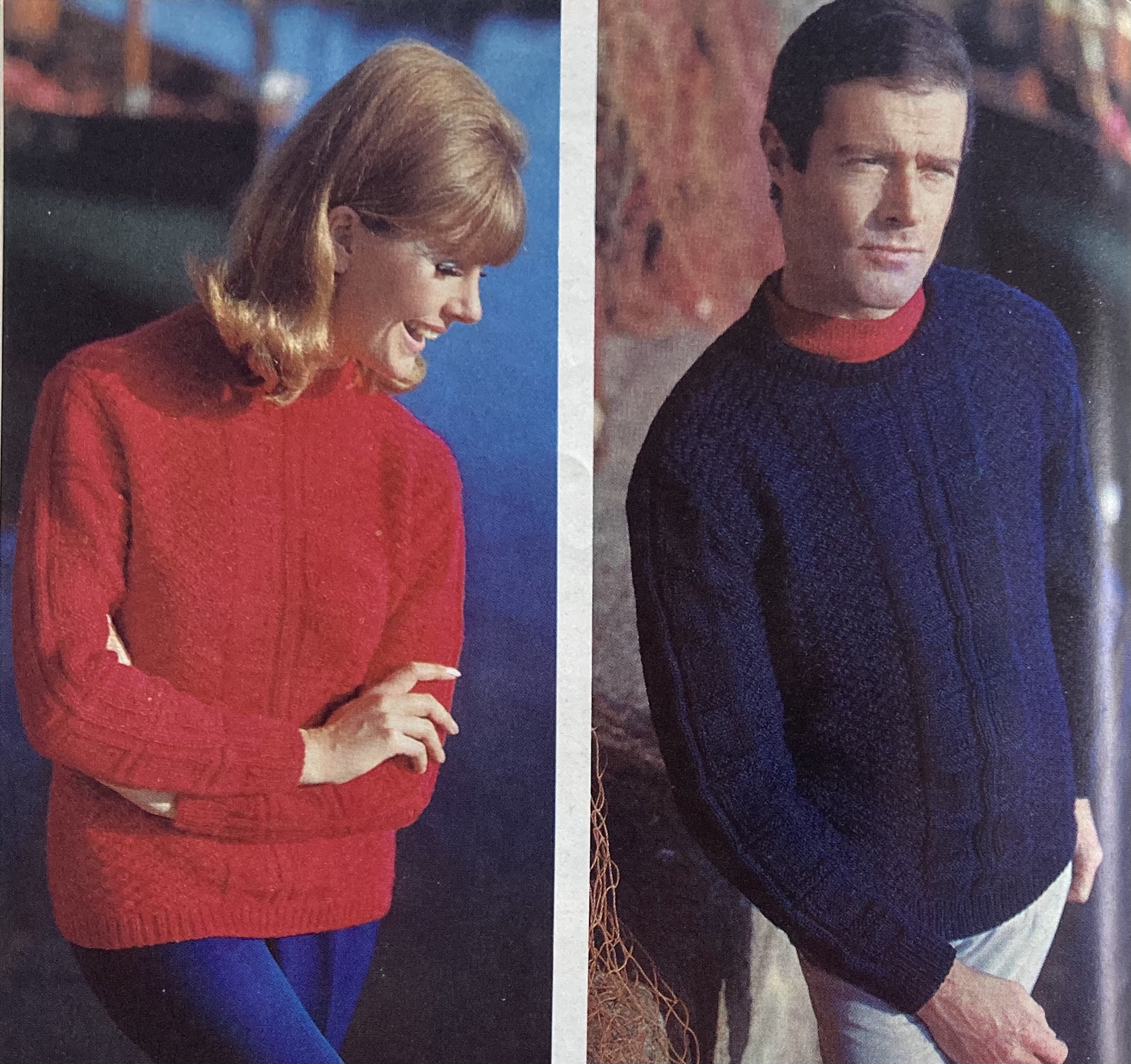 For those not wishing to follow the pattern and colour trends, there’s a three-piece pullover, slipover and cardigan set for men in smooth beige crepe or brown bouclet, and a “country classic” high-buttoned, stocking-stitch cardigan in DK weight Fiona.