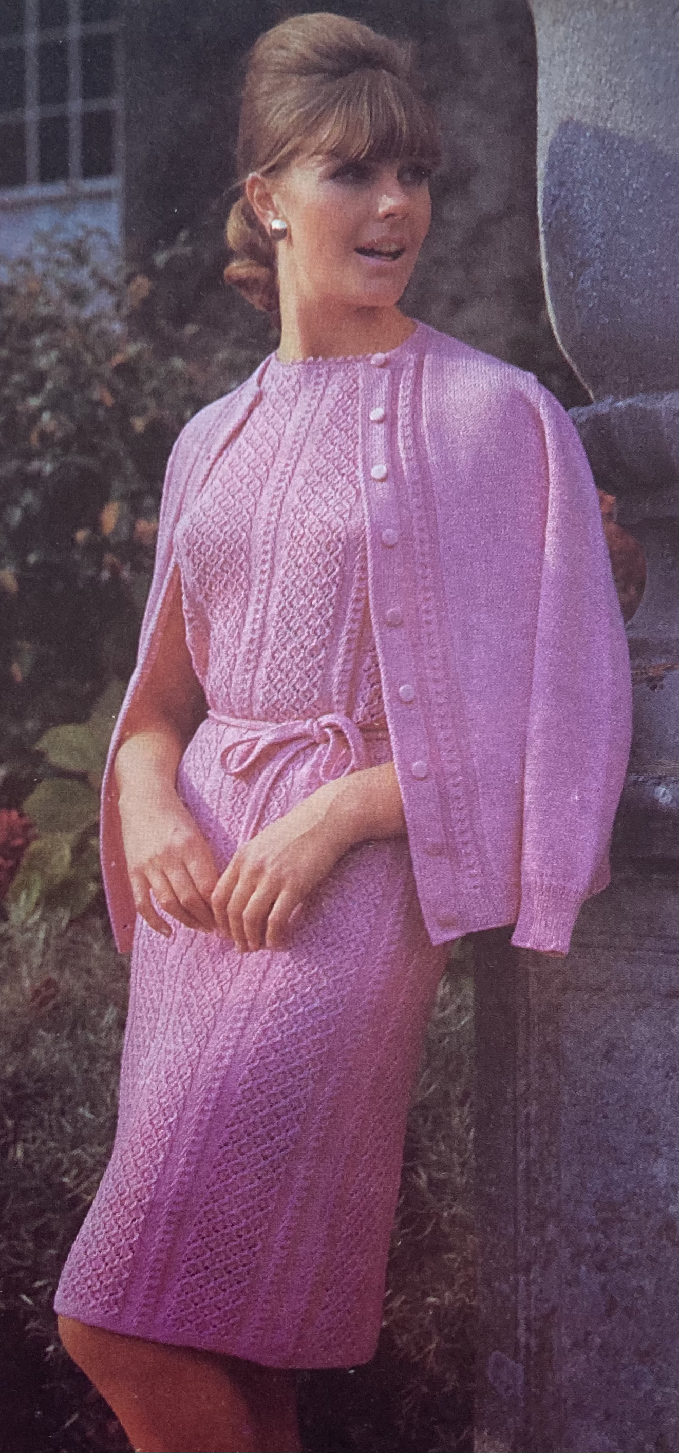 Fans of the knitted look with knitting can make a fluffy lace shell (what a terrible camera angle for the model’s nose), or a classic V-neck cardigan with bobble panels in larger sizes. With the exception of the angora-mohair shell, all are made in DK or slightly heavier wool — it is still winter, after all. Knitters looking ahead to the spring can make a fabulous lace-panel dress with matching cardigan in “Paris Pink” crepe 4-ply. The cardigan has a similar design to the large-size cardigan, just with a narrower bobble band on the fronts and a high-buttoning neck.