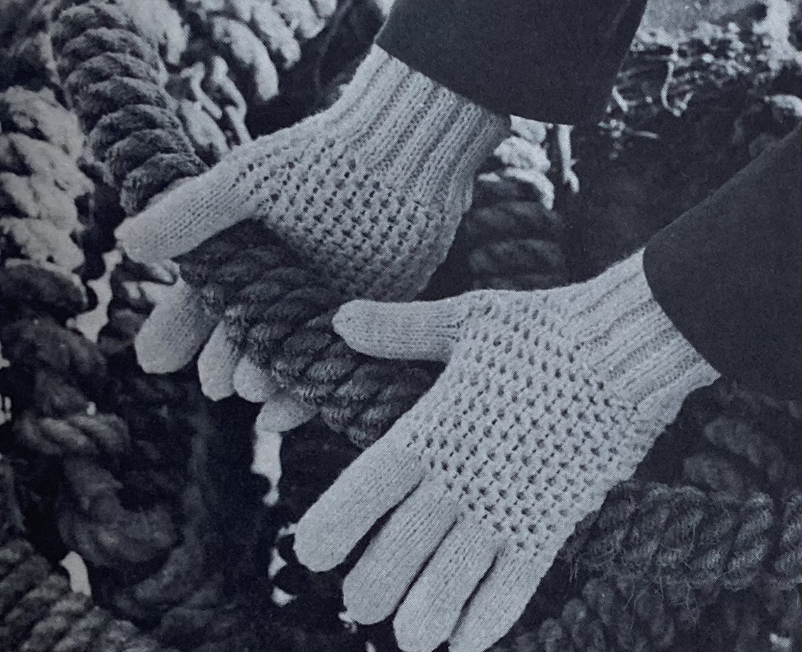 For men, there’s a “sailer with the traditional look” in guernsey style. Instructions are given for “a girl’s a size and a man’s size” (34-36 or 39-41 inch chest) for the partner-look. (Of course, when they say “girl”, they mean a grown woman who doesn’t mind being linguistically infantilised.) The guernsey is nice! There’s a jacket in thick “Capstan” wool for men, as well, which also gives a sort of sailor-y vibe. The interesting stitch pattern is made with twisted stitches set diagonally. Twisted stitches also feature in the men’s “Country Gloves” pattern, where I imagine the stitch pattern makes the gloves particularly warm and hard-wearing.
