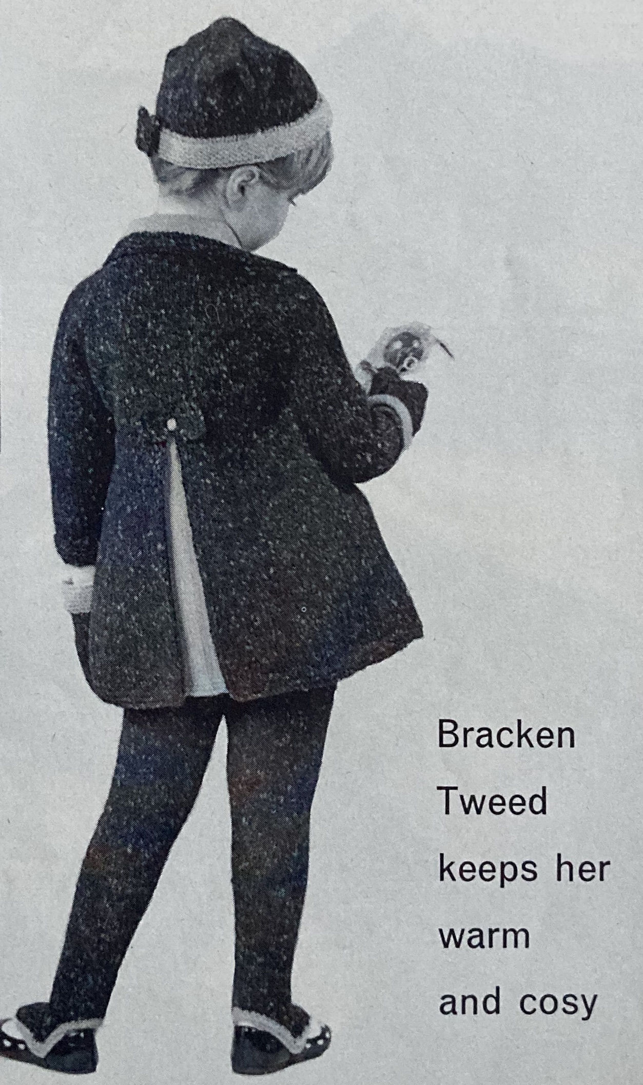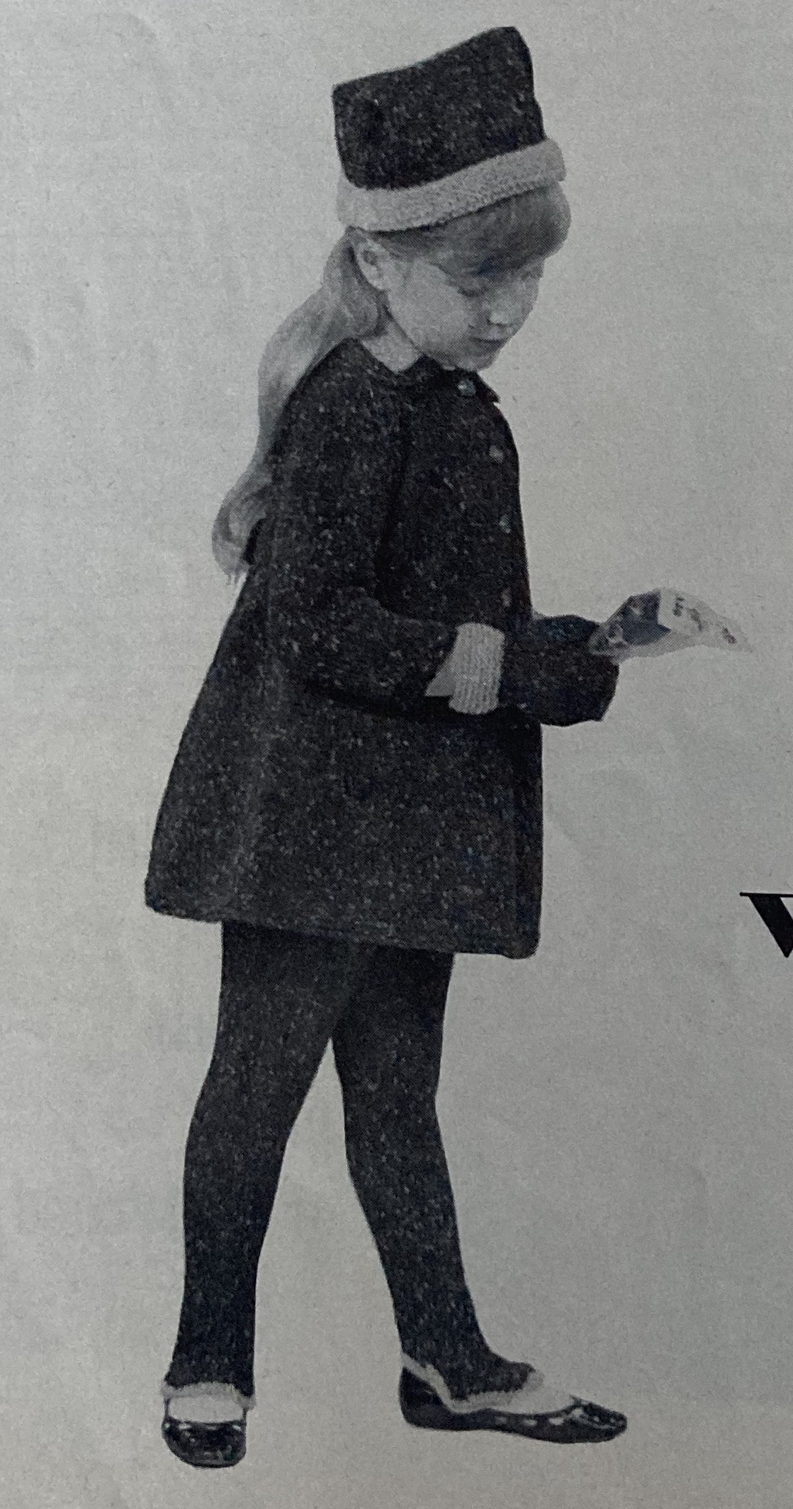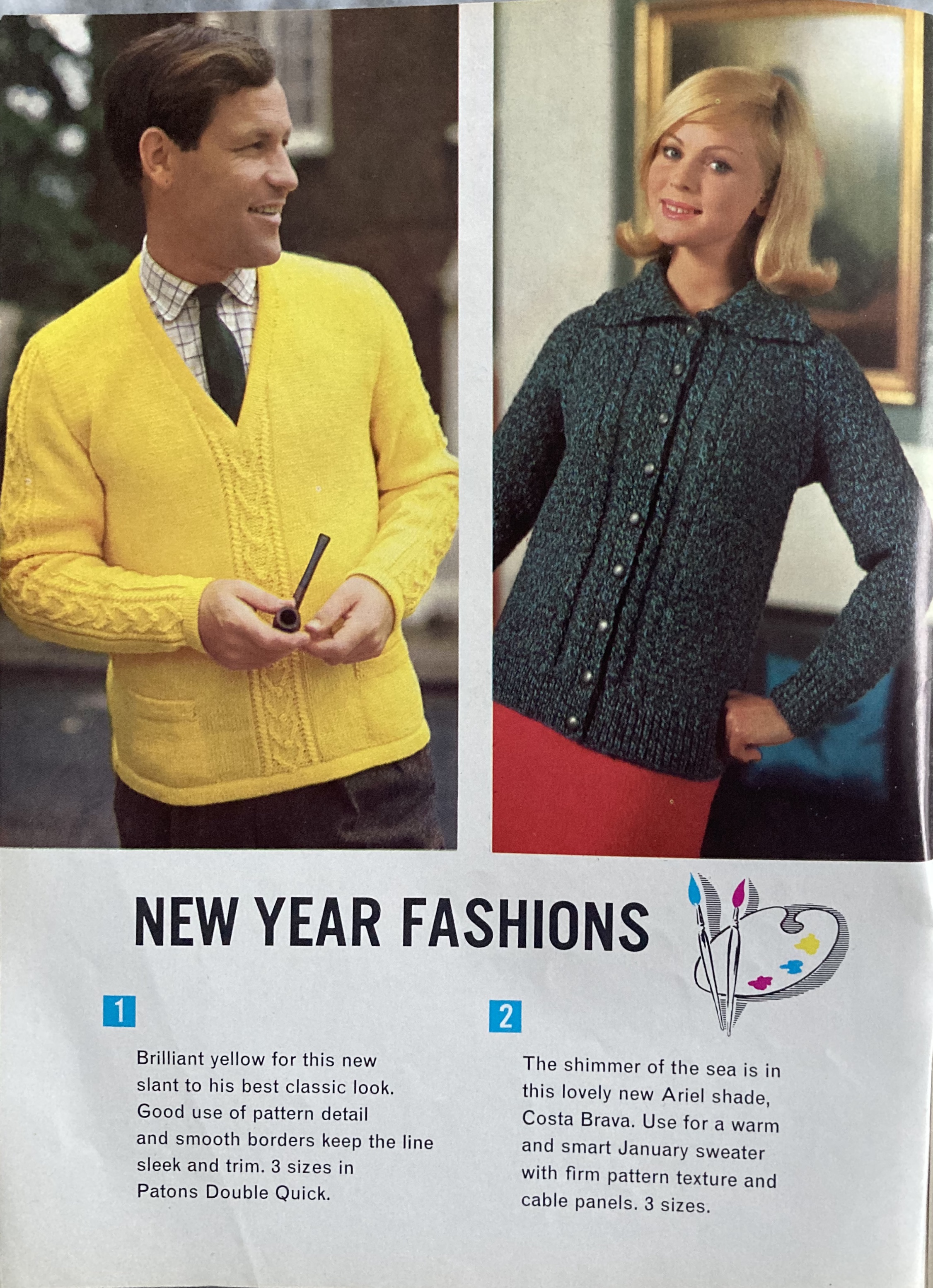 “Colour brilliance” applies to men’s fashions too, for once, and this green and yellow slip-stitch cardigan is a masterpiece. The model looks a bit like a colleague of mine — should I knit it for him? The other men’s garment, a chunky but streamlined pullover, echoes some of the design features of the women’s “fashion switch” combos. like the big patch pocket and contrasting-pattern sleeves. The photo is black-and-white, but the suggested colour is “Curry”, which I assume will be some kind of dark gold-brown-orange (so 60s). For children, there are two nice, sturdy, basic raglan pullovers in a more classic colour scheme — dark charcoal with red trim for the boy’s and “Cloud-dust Pink” with “Aztec Gold” trim for the girl’s.