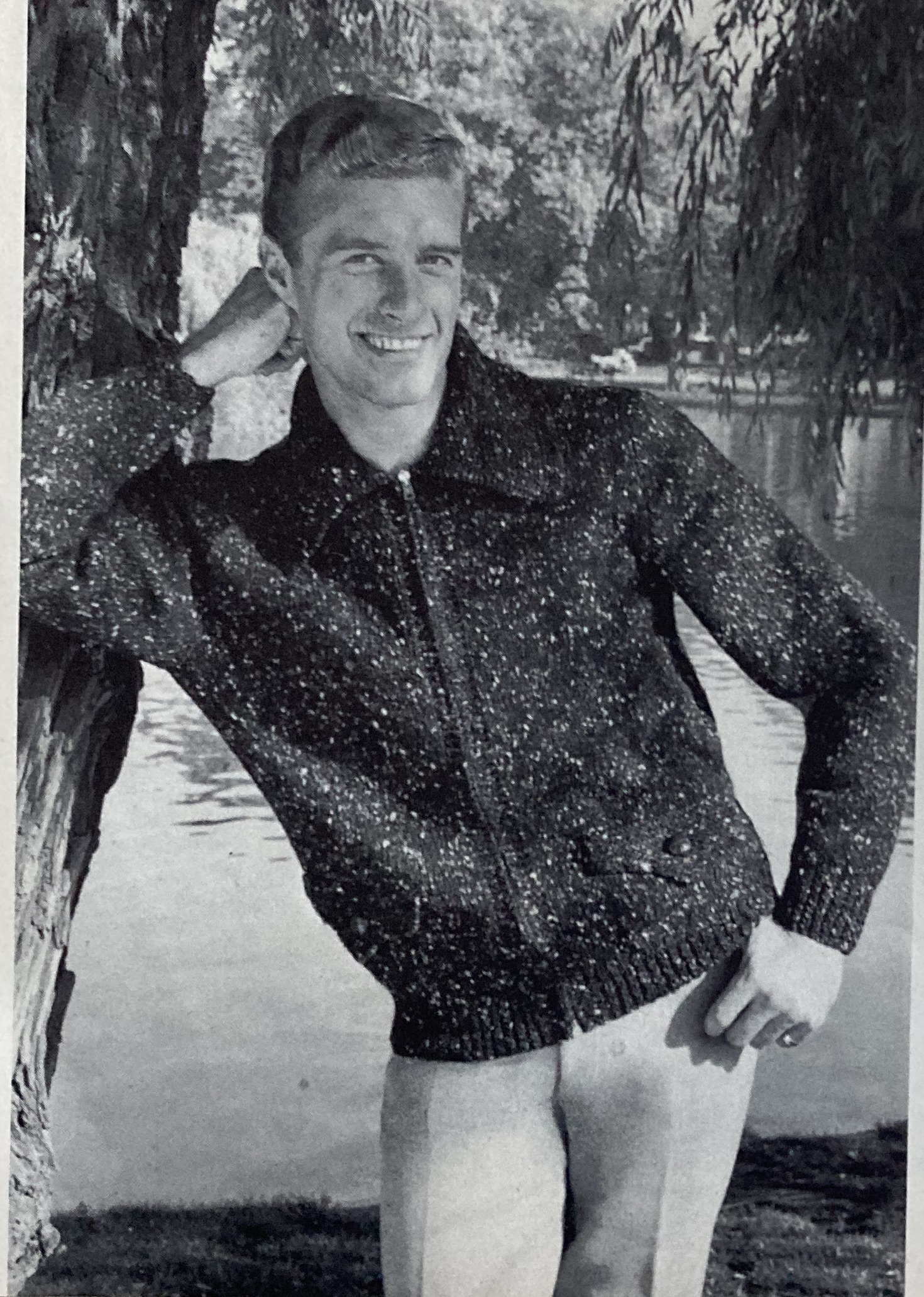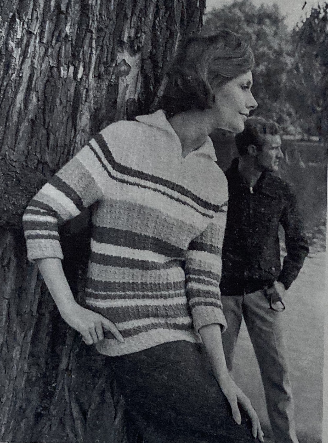 Other women’s knits include a bouclet blouse for the fuller figure with a very neat and pretty “soft-roll” neckline, a casually elegant afternoon suit with cable trims, a striped skirt combo in “colour brilliance” (tangerine and violet!), and a “Golden Glow” bright yellow pullover.