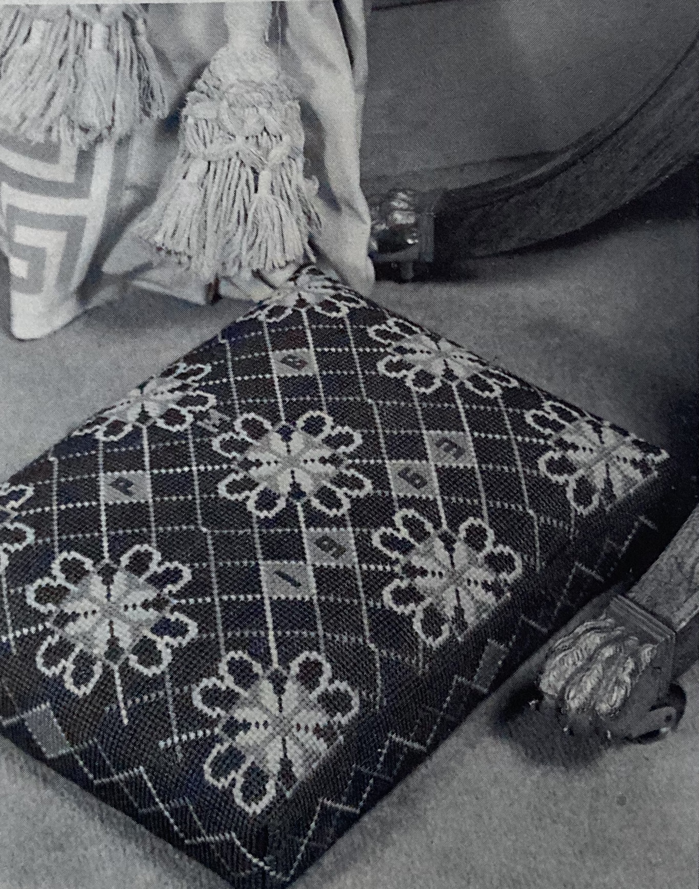 Or you can make a Florentine-pattern workbag or cushion for yourself. The colours — gold, green, and yellow — will match nicely with a lot of the knitted designs from this month.
