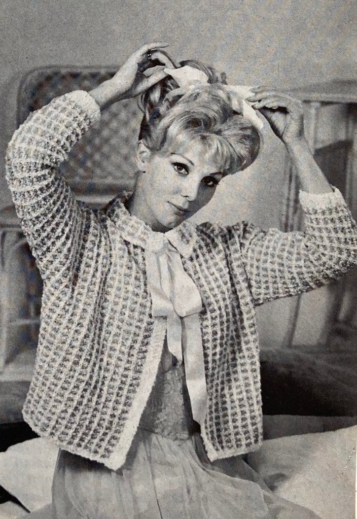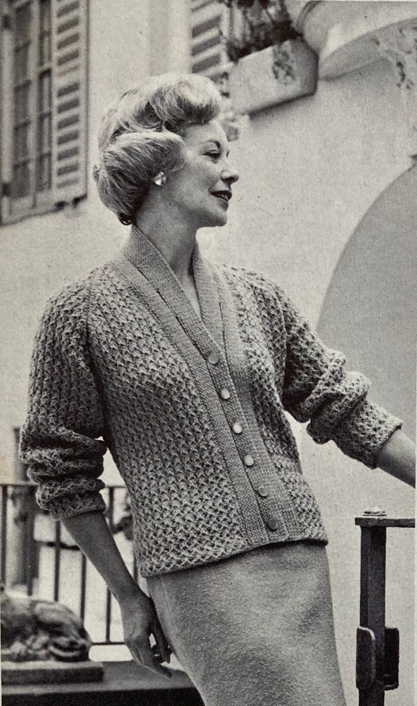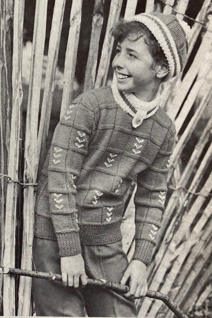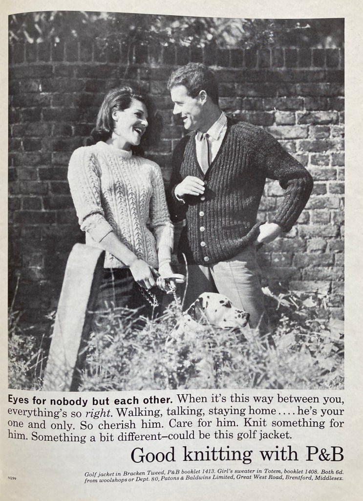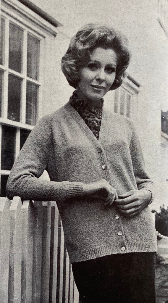 As for the “young team”, they “love to match”, according to Stitchcraft, and can knit themselves (who am I kidding, the girl will knit for both of them) some warm pullovers in a fun two-colour basketweave pattern with ribbed sleeves. The colour pattern is made with slip stitches. Other adult garments include a “lumber style” mens’ zipped cardigan, two practical jumper-blouses to “go with suits and skirts” and a classic cardigan for larger sizes.