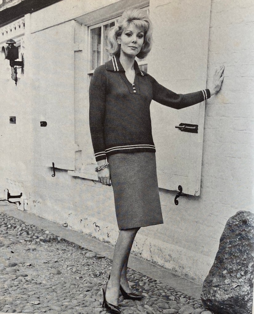 Children of all ages can look forward to practical, yet stylish winter garments — a knitted outdoor play-suit for toddlers in warm, bulky Big Ben, a smart fine-knit twin-set for girls of varying ages (sizes from 26-30 inch chest) and a wonderful knitted dress in a two-colour slip-stitch pattern that fits right into the tweed trend. The photo caption claims that Alison (the young model) is “warm as toast” but of course, her legs are going to be cold! She still seems pretty happy, though.